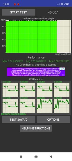 В троттлинг-тесте Redmi Note 9 Pro также показал себя неплохо. Смартфон работал стабильно, проседаний почти не было, а средний уровень производительности составил 175 GIPS — хороший результат.