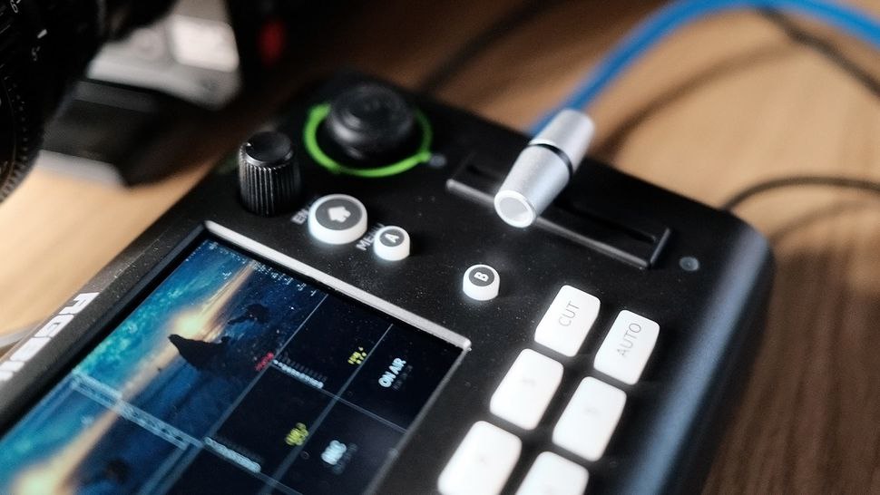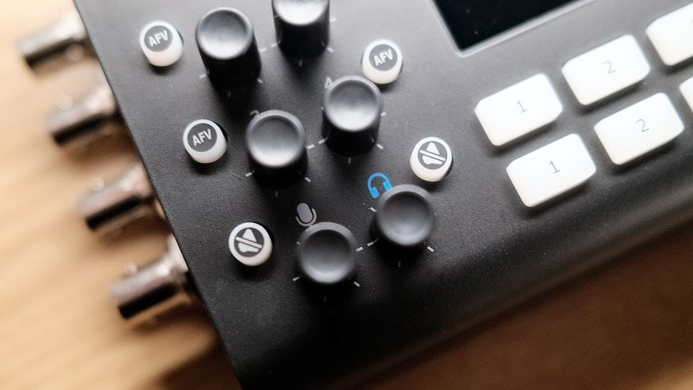 Затем идёт верхняя панель. На ней расположены джойстик для управления PTZ-камерой, Т-образная панель, кнопки меню и кнопки выбора канала, которые подсвечиваются белым, зелёным или синим цветом, чтобы вы могли видеть, какой канал выбран для различных целей. Каждый вход HDMI оснащён поворотной ручкой для регулировки уровня звука и кнопкой автоматического выбора фокуса, а также элементами управления для входящего аналогового звука и уровнями основного выхода.