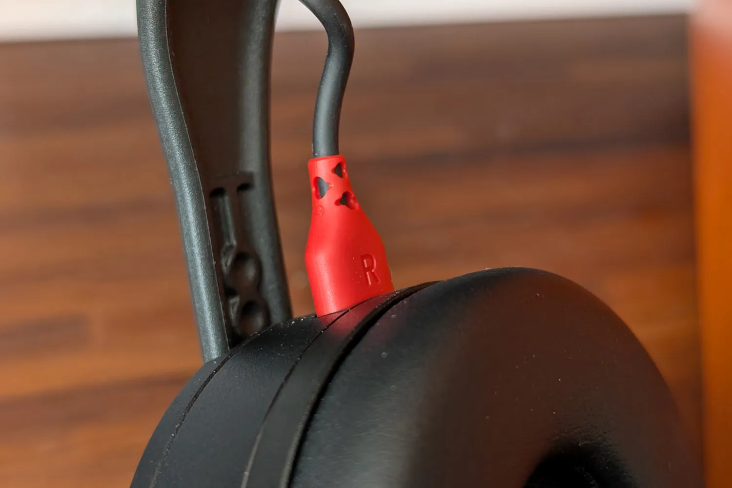 Красная окантовка на правом наушнике и кабеле позволяет с первого взгляда определить, где какая сторона, но мне нравится, что Rode также добавила символы Брайля рядом с 3,5-миллиметровыми разъёмами, чтобы можно было определить, не глядя, — удобно, если вы находитесь в слабо освещённой диджейской кабине.