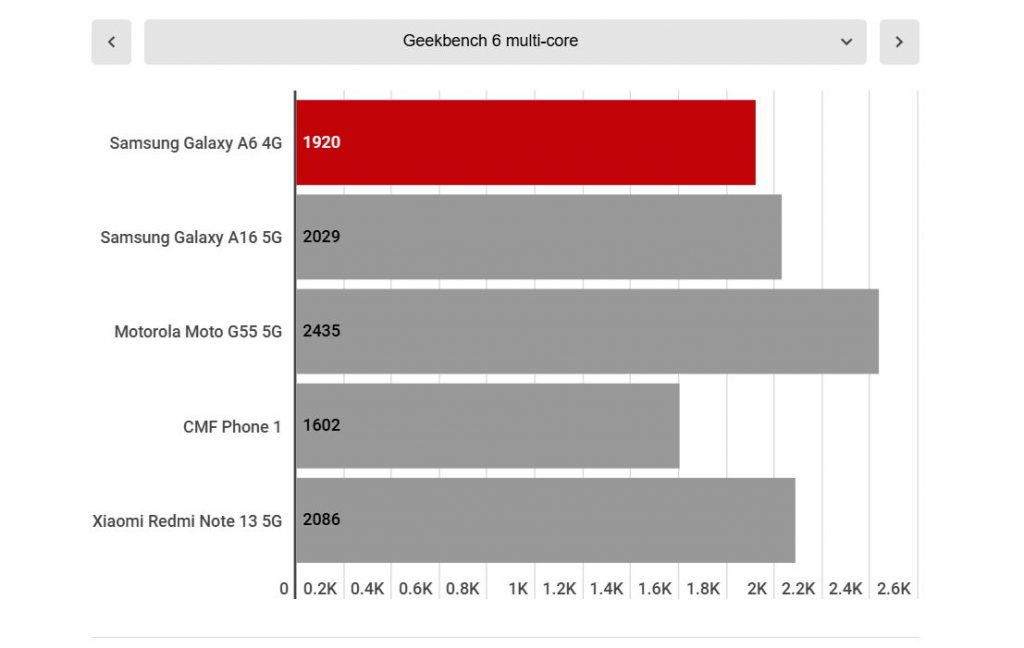 В целом, производительность Samsung Galaxy A16 в 2025 году оставляет желать лучшего, особенно по сравнению с конкурентами по той же цене, такими как Redmi Note 13 или Poco X6, которые оснащены более новыми и мощными чипсетами. С результатом 1920 баллов в многоядерном тесте Geekbench 6 этот смартфон значительно уступает Poco X6, который оснащён чипом Snapdragon 7s Gen и имеет результат 3480 баллов в многоядерном тесте. Galaxy A16 даже набрал примерно на 100 баллов меньше, чем его аналог с поддержкой 5G.
