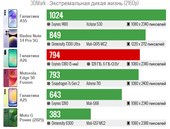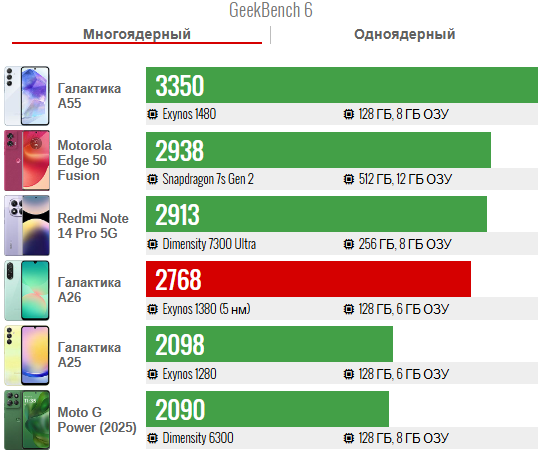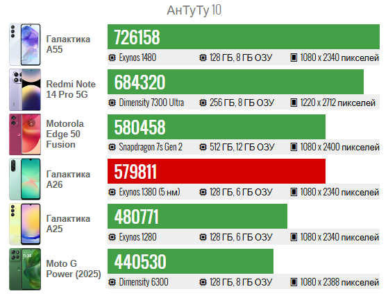 Как видите, есть несколько смартфонов, которые мощнее Galaxy A26 и стоят примерно столько же. На самом деле, Galaxy A26 превосходит только Moto G Power (2025) и прошлогодний Galaxy A25.