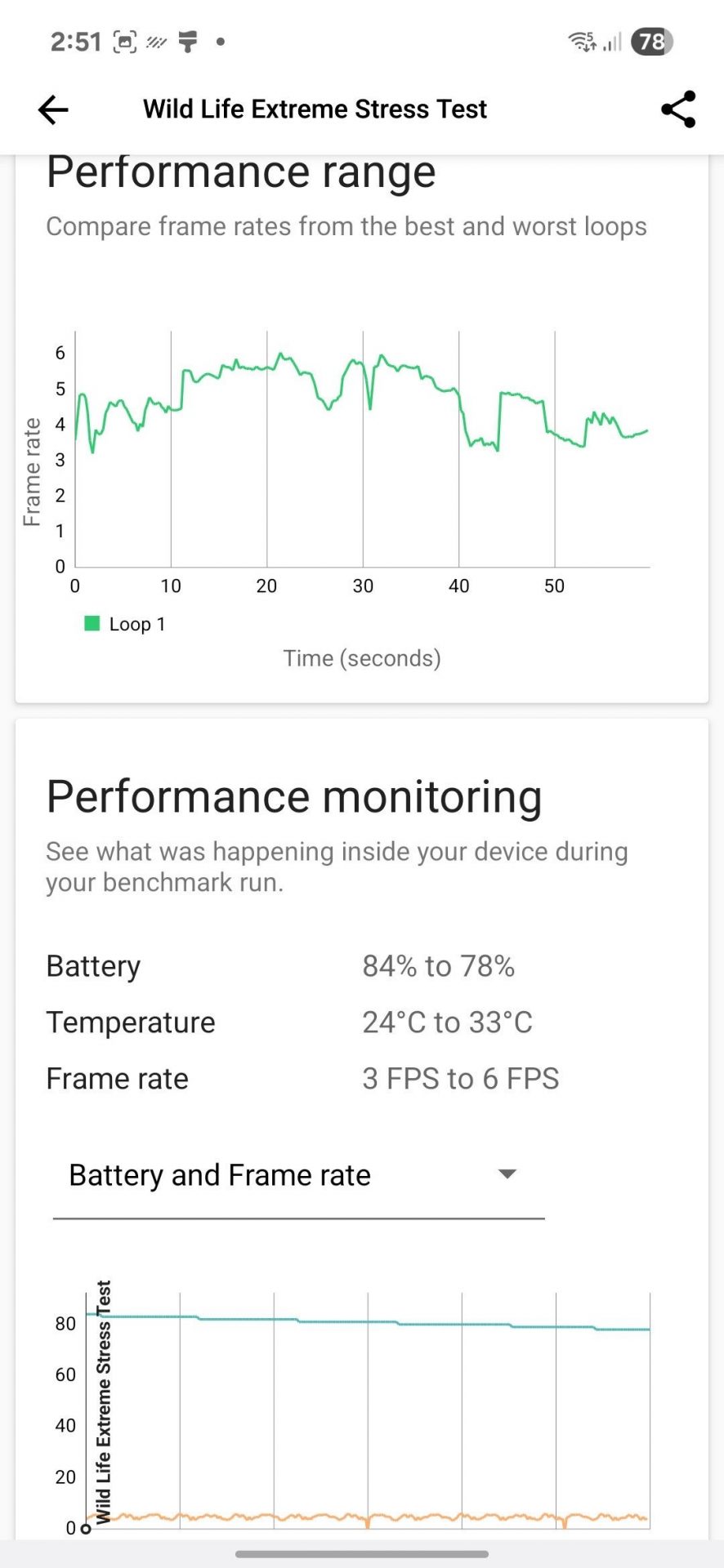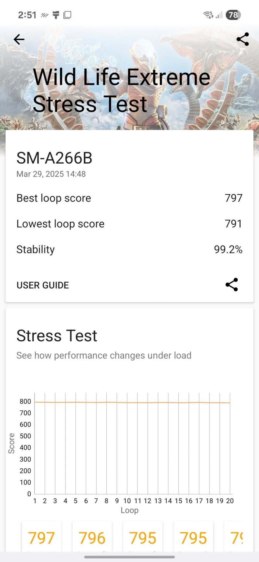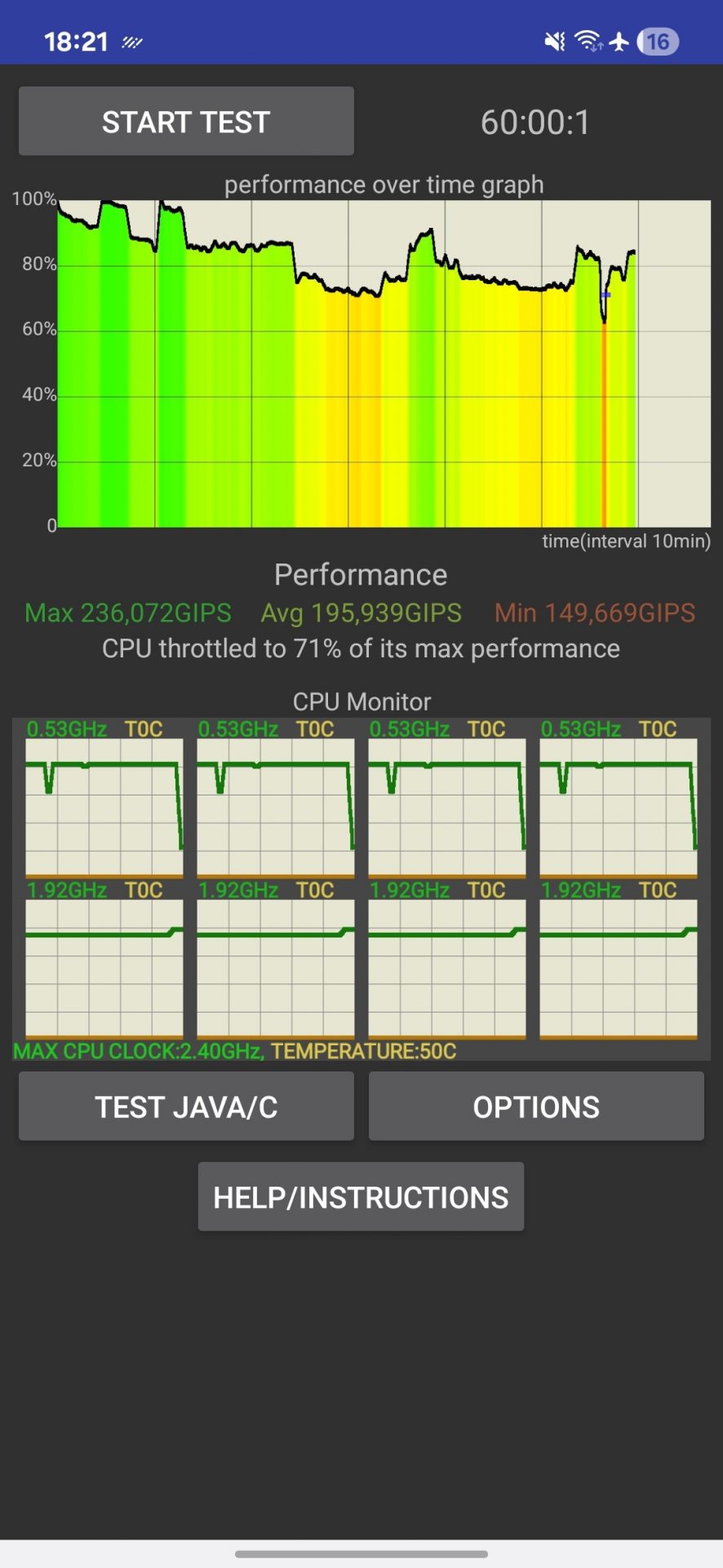 Galaxy A26 смог поддерживать приличную тактовую частоту процессора во время стресс-теста, но мы ожидали большего, учитывая, что SoC Exynos 1380 изначально не очень мощный. Чип снизил производительность до 71% от теоретической, но большую часть времени поддерживал уровень около 80%.