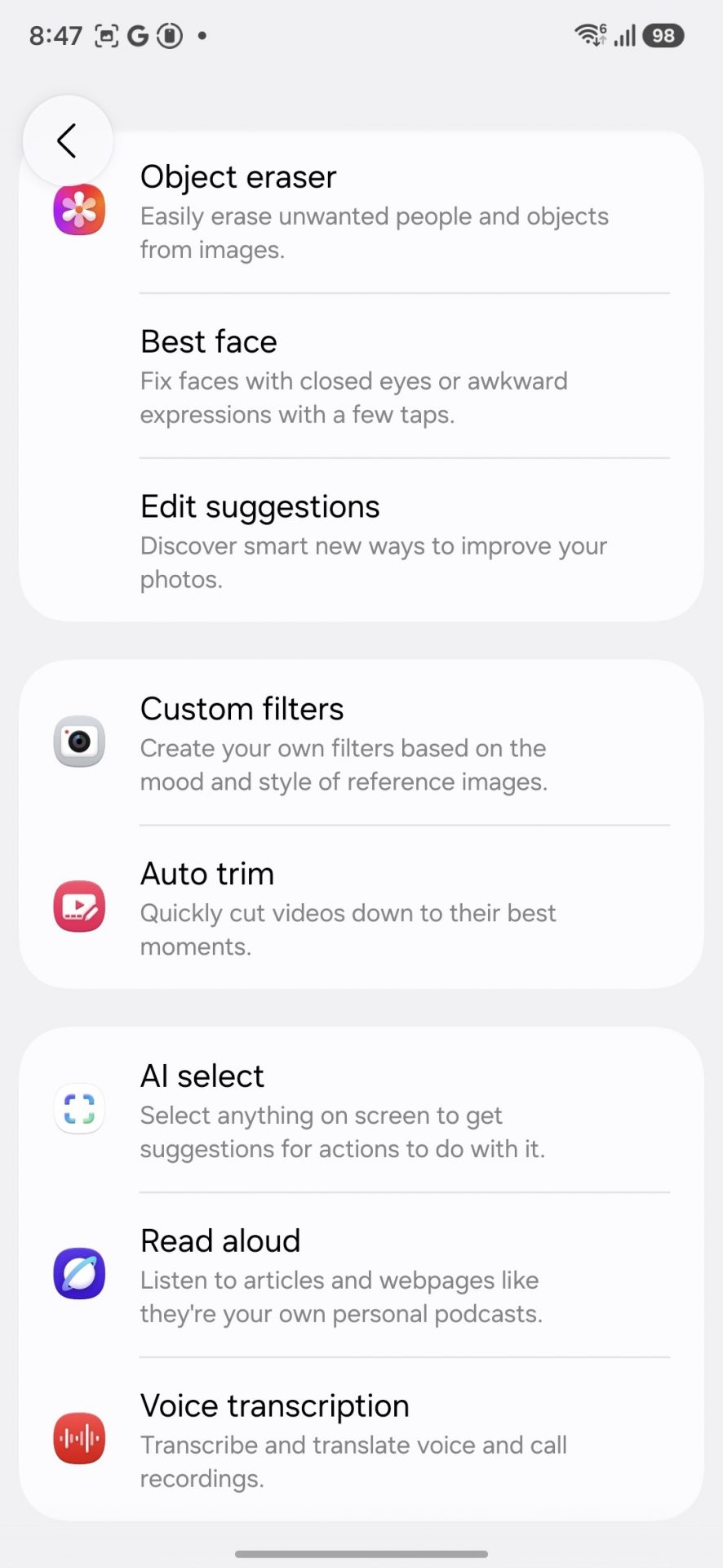 А вот нейросетевых фишек из старшей S-серии отсыпали не всем. В галерее можно удалять лишние объекты, подставлять лучшие лица на групповых фото и пользоваться умными рекомендациями по обработке. Есть автокадрирование видео, текстовая расшифровка голосовых звонков, озвучка страниц в браузере и ИИ-выделение объектов на экране. А вот десктопного режима DeX в A57, увы, нет.