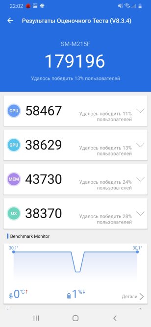 Знакомая по смартфону M30s проблема, связанная с нагревом передней стороны корпуса, так и не исчезла. При запуске тяжелых игр в верхней части экрана, пальцами из-за нагрева может ощущаться неприятное покалывание, что едва ли способствует комфортному прохождению игрушек, и в целом для большинства смартфонов такая проблема нетипична. В теории такой нагрев может даже привести к проблемам с дисплеем.