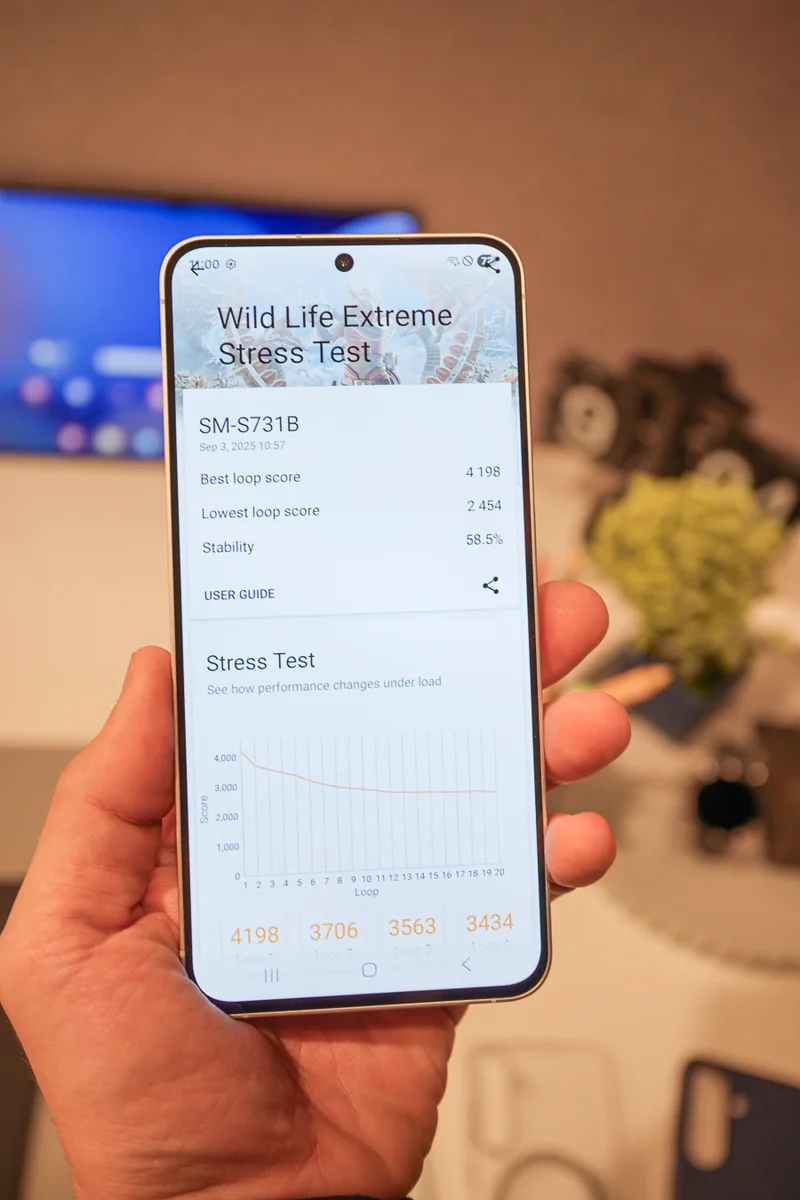 Тест производительности графики даёт ещё более чёткую картину: S25 FE показывает лучшие результаты в однопроходном режиме и очень похож на своего предшественника при постоянной нагрузке. Телефон снова превосходит Pixel 9a и Galaxy S24 FE, а также своего собрата из серии A, Galaxy A56.