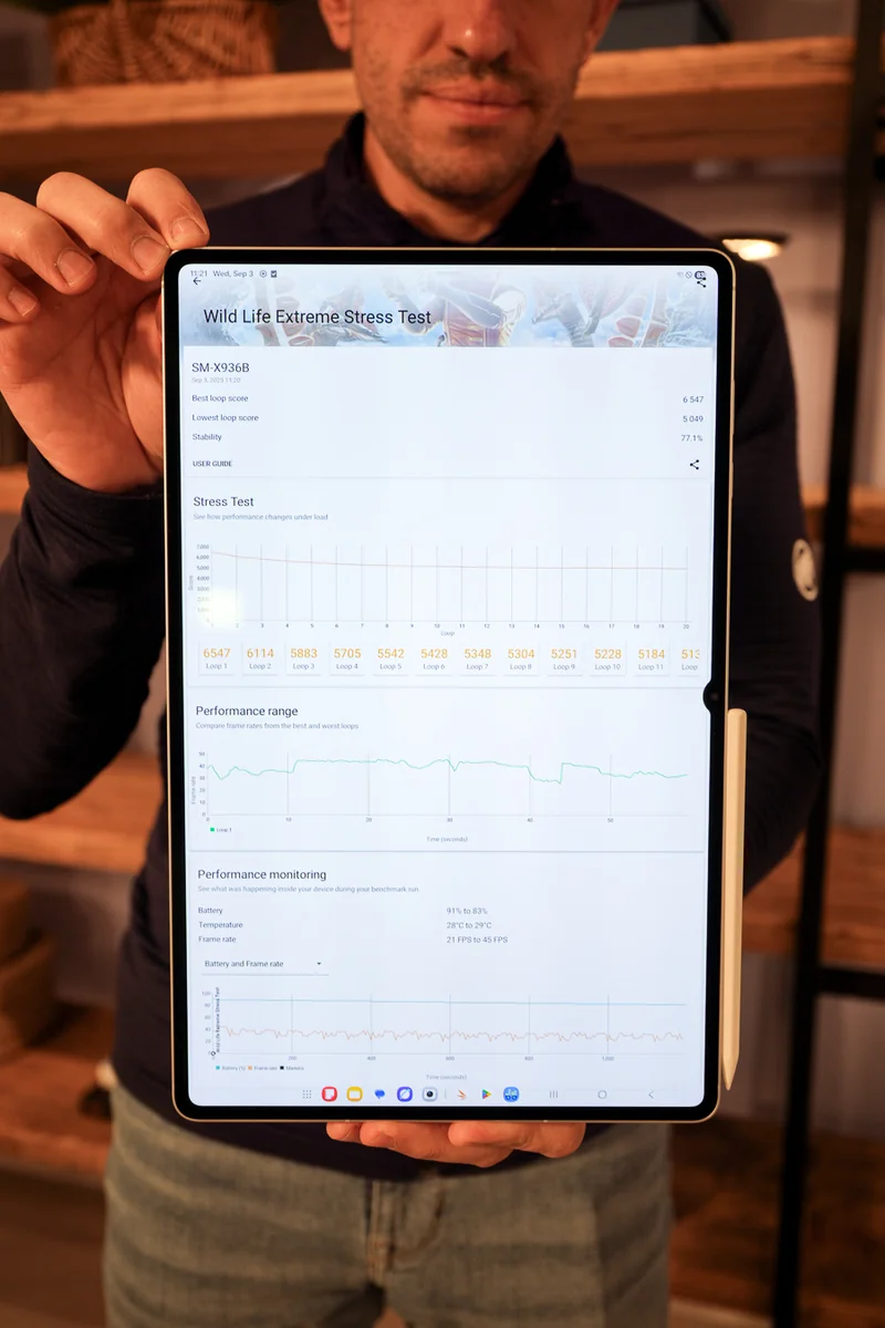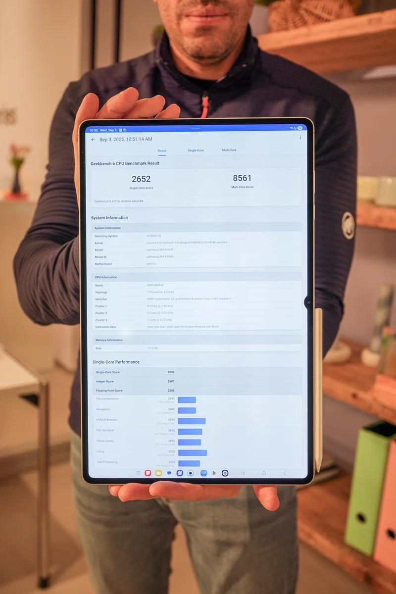 Эта 37,1 см панель имеет антибликовое покрытие (мы не уверены, что оно такое же, как на Galaxy S25 Ultra, но оно действительно уменьшает блики) и разрешение 2960 x 1848 пикселей. Из-за огромной диагонали экрана плотность пикселей составляет скромные 239 пикселей на дюйм.