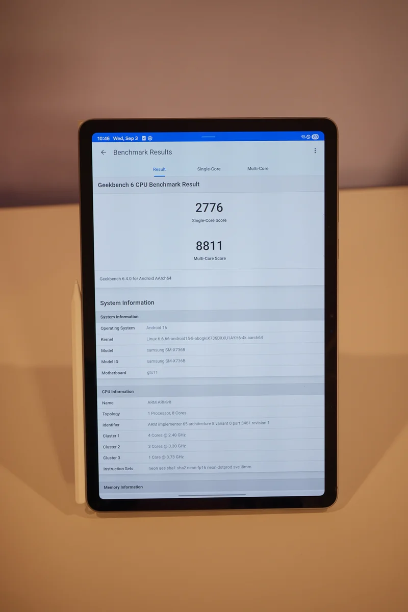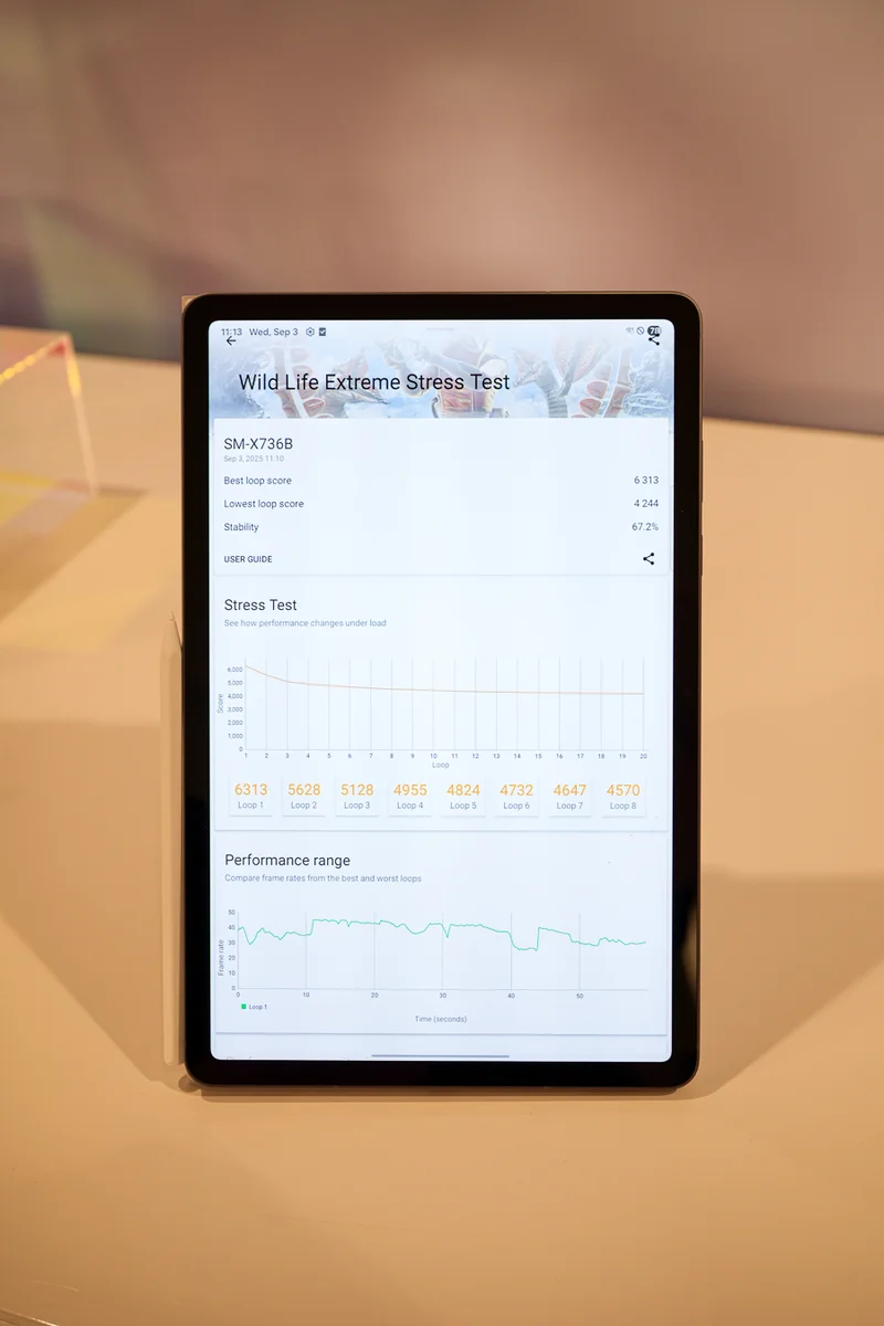 Мы также провели несколько тестов, чтобы проверить производительность нового процессора Dimensity 9400+. В Geekbench 6 Galaxy Tab S11 набрал 2776 баллов в одноядерном тесте и 8811 баллов в многоядерном, что ставит его в один ряд с другими флагманскими устройствами на Android в этом году. В стресс-тесте Wild Life Extreme от 3DMark максимальная частота составила 6313 в лучшем цикле, а минимальная — 4244, что соответствует показателю стабильности около 67 %. Это свидетельствует о высокой начальной производительности с некоторым снижением при длительной высокой нагрузке, что неудивительно для тонкого 28 см корпуса планшета.