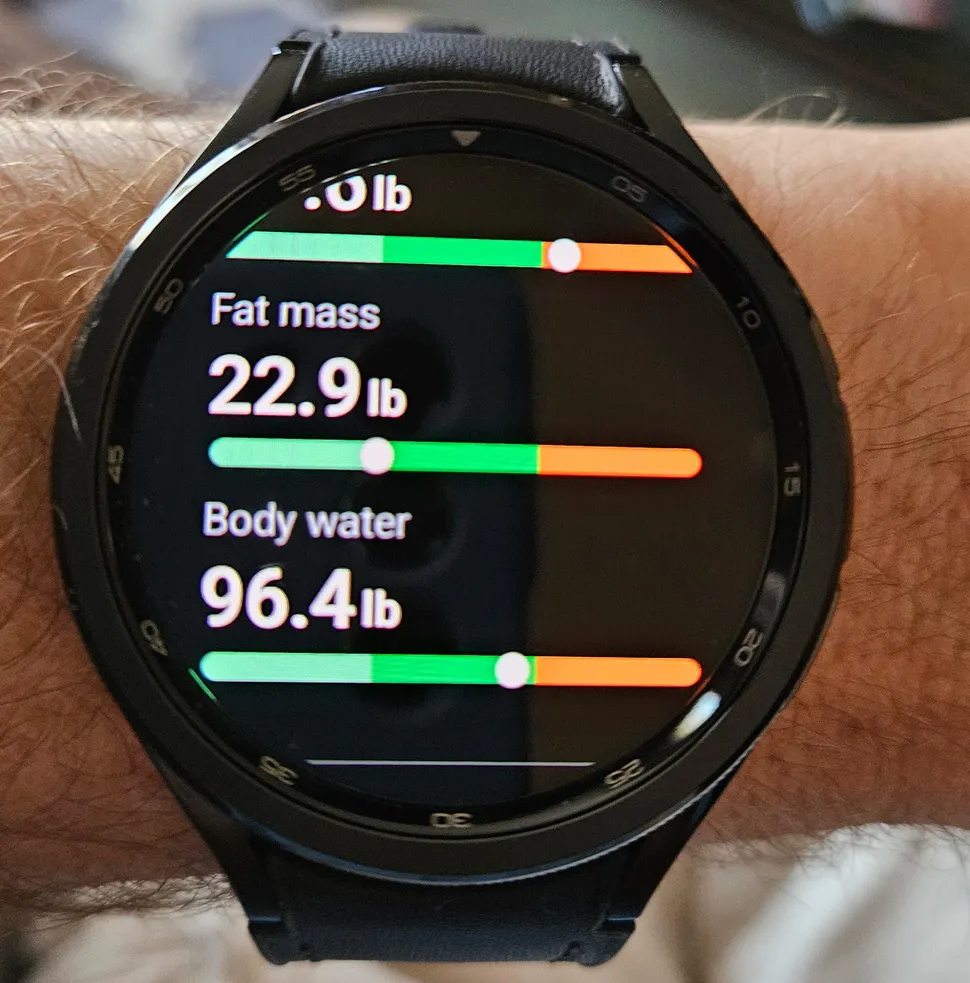 Часы могут даже оценить состав вашего тела, чего я раньше никогда не делал. Вы вводите данные о своём росте и весе, а затем аккуратно прикладываете средний и безымянный пальцы к двум кнопкам на часах, не касаясь руки. Это нужно для того, чтобы часы могли посылать через ваше тело слабый электрический ток для измерения костной, жировой и мышечной массы, как это делают лучшие умные весы. Этот процесс называется биоэлектрическим импедансным анализом, и он хоть и неудобный, но работает.