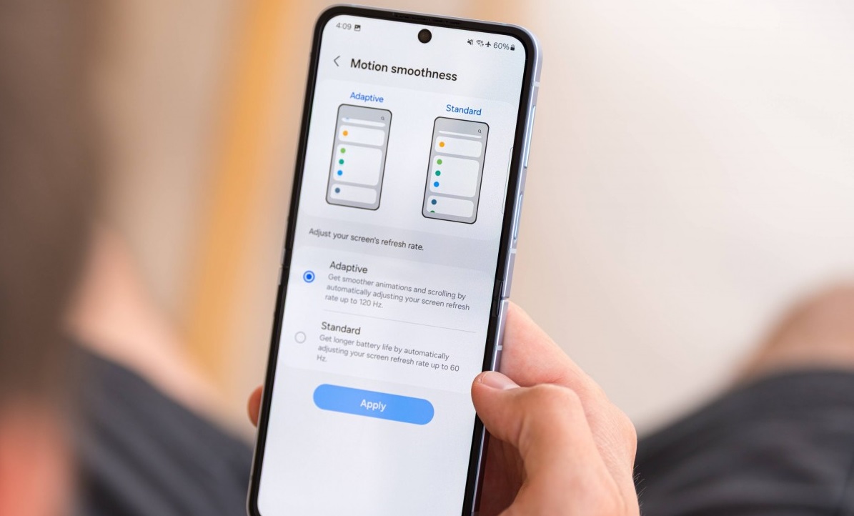 Управление частотой обновления в Samsung довольно простое: в меню есть опции Adaptive и Standard – фактически потолки 120 Гц и 60 Гц. Эти параметры применимы только к основному экрану – внешняя панель ограничена 60 Гц.