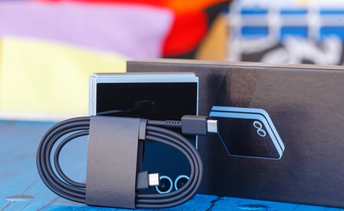 Galaxy Z Flip6 поставляется в минималистичной черной картонной коробке с малым количеством аксессуаров, а именно: кабель USB-C и инструмент для извлечения лотка SIM-карты.