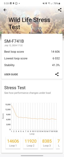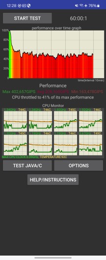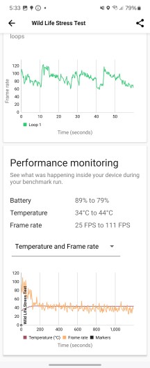 Однако насколько хорошо она справляется со своей задачей, можно поспорить, глядя на результаты, полученные в ходе тестирования при длительной нагрузке. Во время тестирования в лаборатории было достаточно жарко, хотя и работал кондиционер. Razr 50 Ultra немного лучше справился с нагрузкой на процессор, а в тесте графики раскладушки показали схожие результаты.