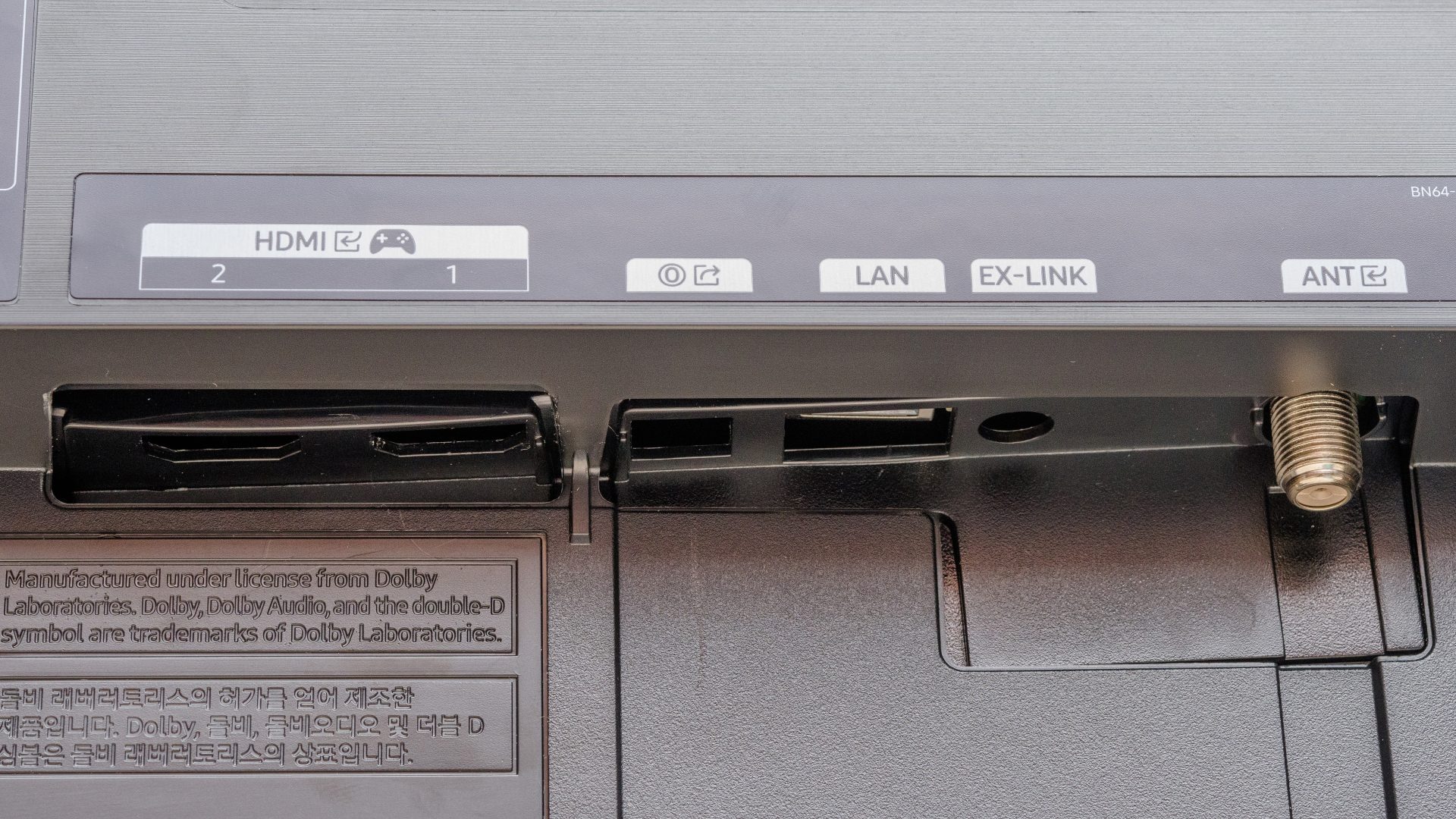 Задняя панель телевизора такая же, как у Samsung S90C OLED, но с матовым покрытием. Центральная панель с разъемами выполнена из гладкого пластика, в комплект входят крышки и защелки, которые можно использовать для организации кабелей. Как и в большинстве телевизоров, до разъемов трудно добраться, если телевизор закреплен на стене.