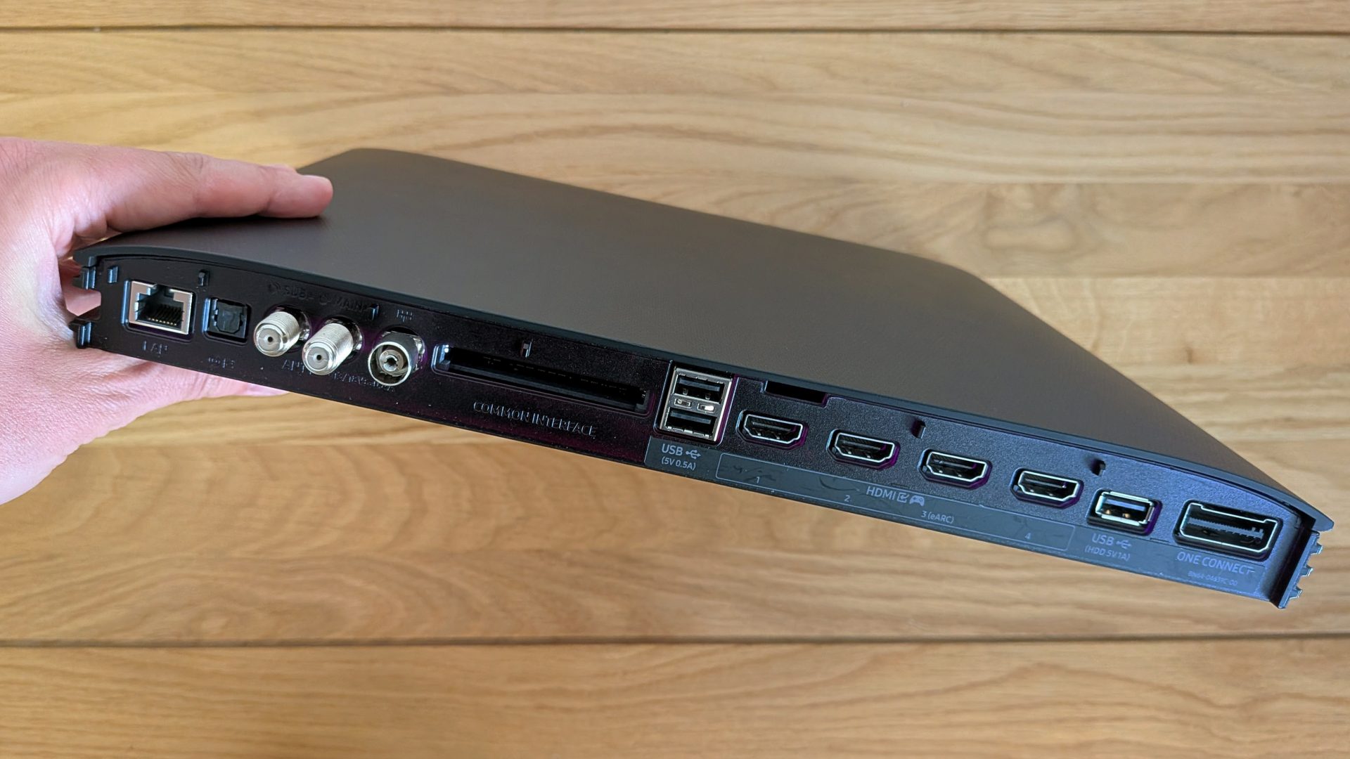Такой дизайн не является чем-то новым для топовых телевизоров Samsung, но я считаю его гениальным. При этом нет никаких компромиссов: все четыре порта HDMI соответствуют стандарту 2.1 и поддерживают передачу сигнала с частотой, даже превышающей желаемые 120 Гц, о которых мечтают геймеры и те, кто покупает с заделом на будущее. Здесь все четыре порта могут работать на частоте до 165 Гц при подключении к соответствующим источникам, хотя на данный момент это доступно лишь немногим мощным игровым ПК.