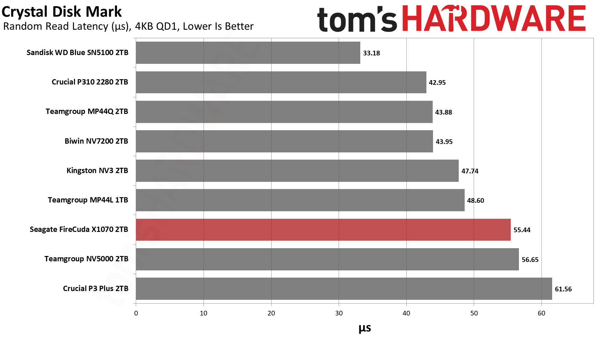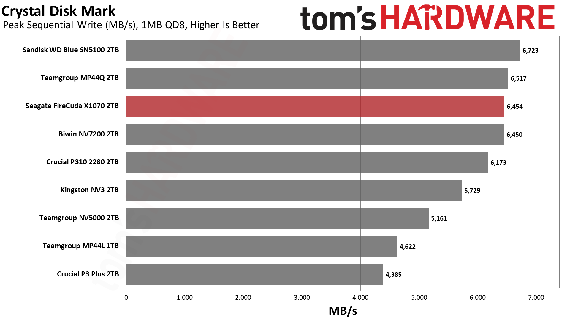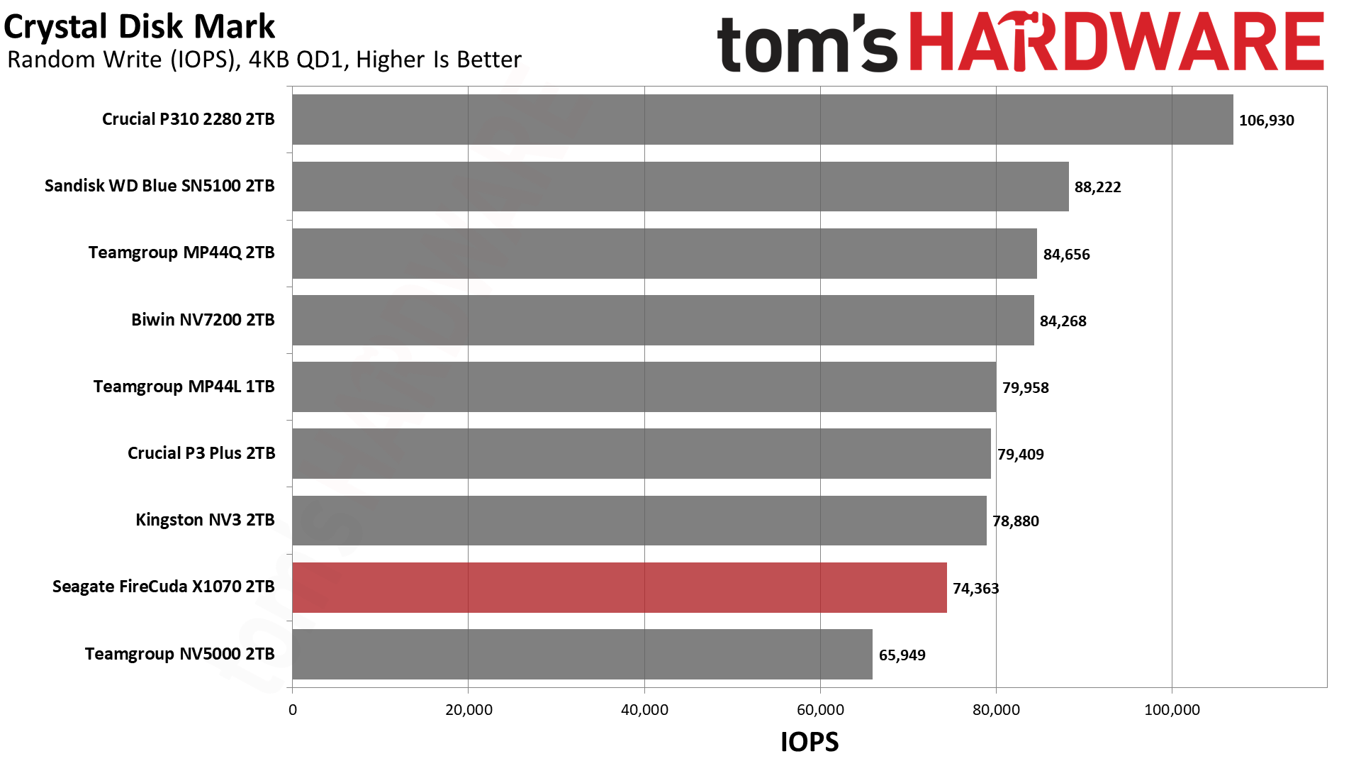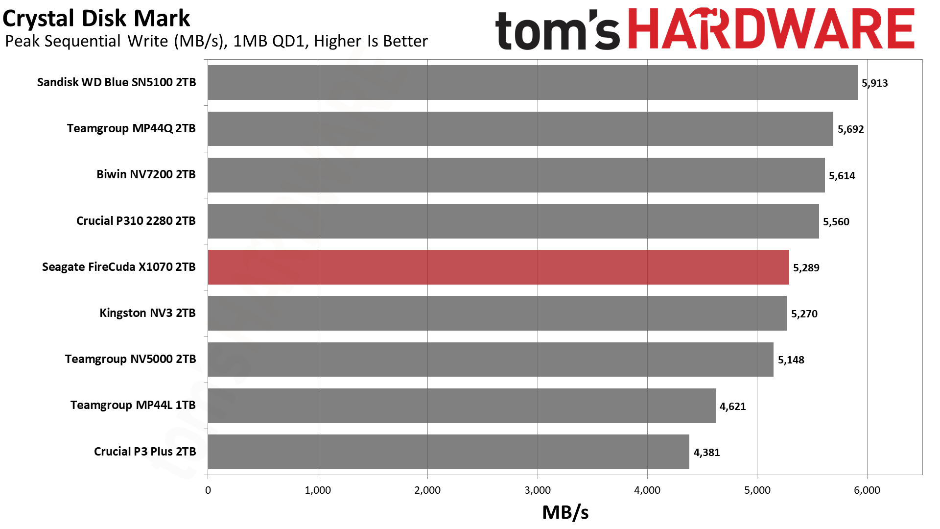 Это говорит о том, что в данном тесте решает чистая линейная скорость, а не сложность контроллера. Накопители, способные стабильно гонять потоки данных, вырываются вперёд — это же справедливо для P310 и SN5100. При этом SN5100 тащит за счёт новейшей памяти BiCS8 QLC, а P310 просто шикарно оптимизирован. FireCuda X1070 попадает в плотную группу хорошистов, а значит, система на нём будет летать куда бодрее, чем на дисках прошлых поколений.