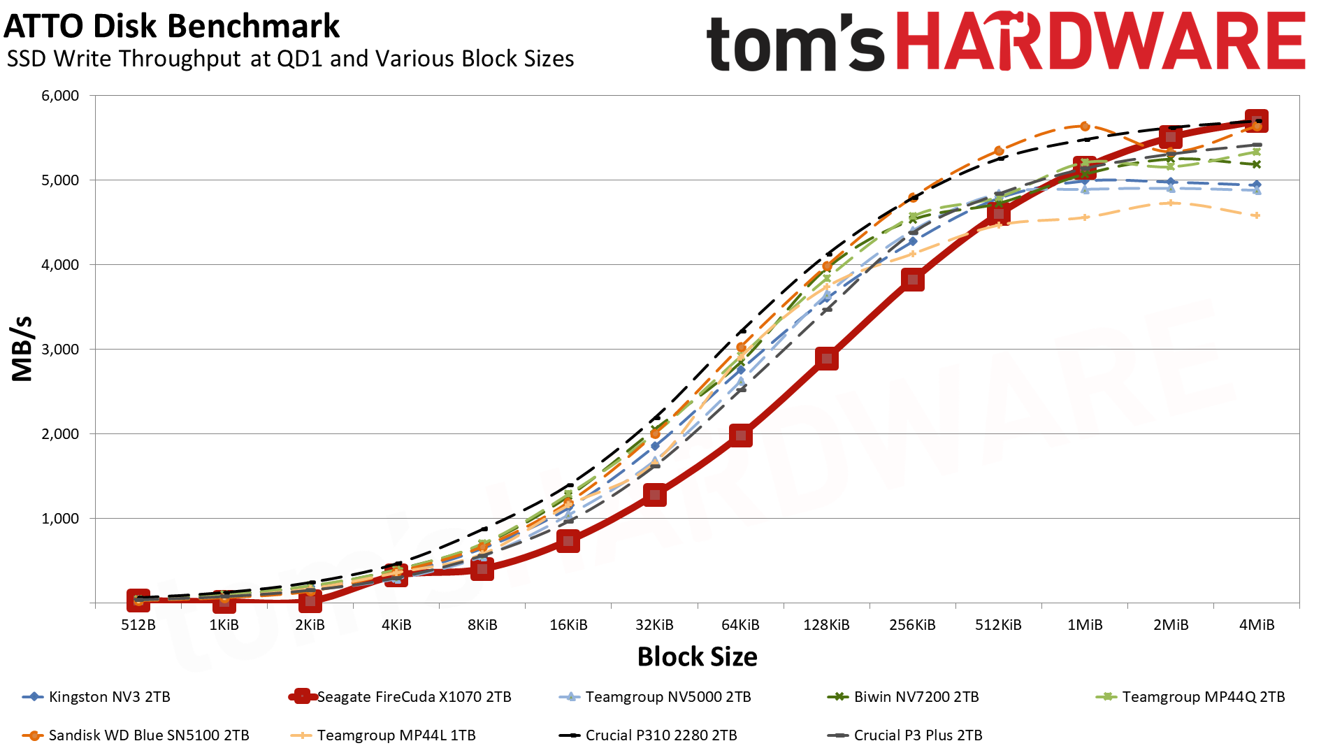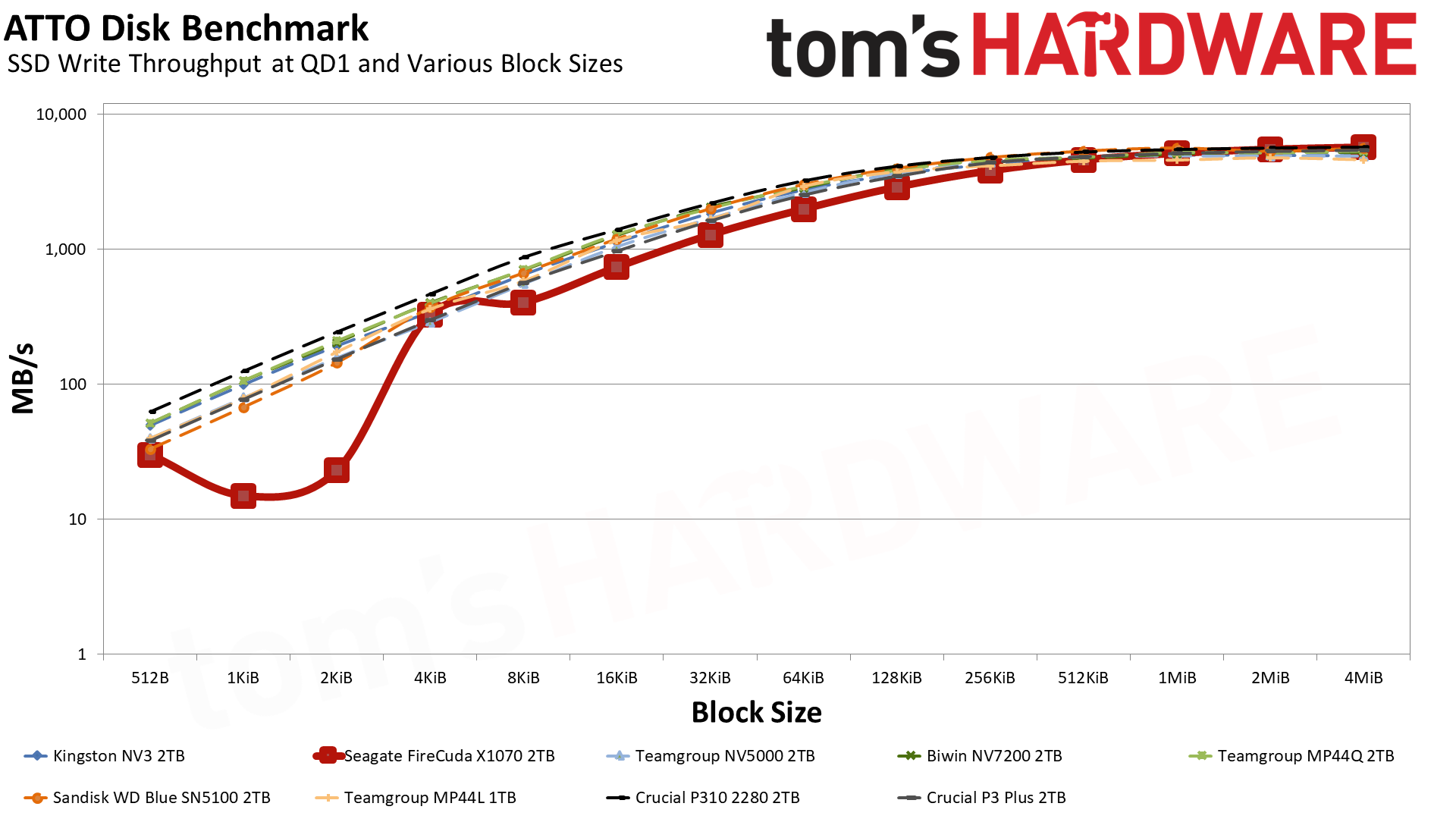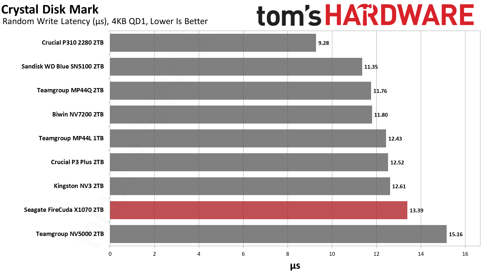 Это говорит о том, что в данном тесте решает чистая линейная скорость, а не сложность контроллера. Накопители, способные стабильно гонять потоки данных, вырываются вперёд — это же справедливо для P310 и SN5100. При этом SN5100 тащит за счёт новейшей памяти BiCS8 QLC, а P310 просто шикарно оптимизирован. FireCuda X1070 попадает в плотную группу хорошистов, а значит, система на нём будет летать куда бодрее, чем на дисках прошлых поколений.