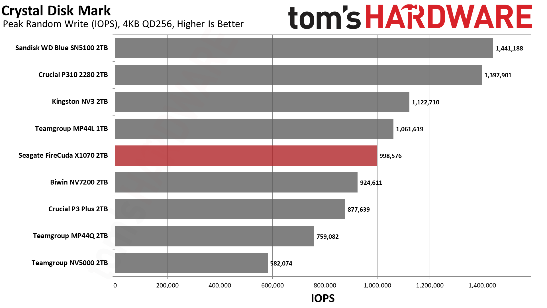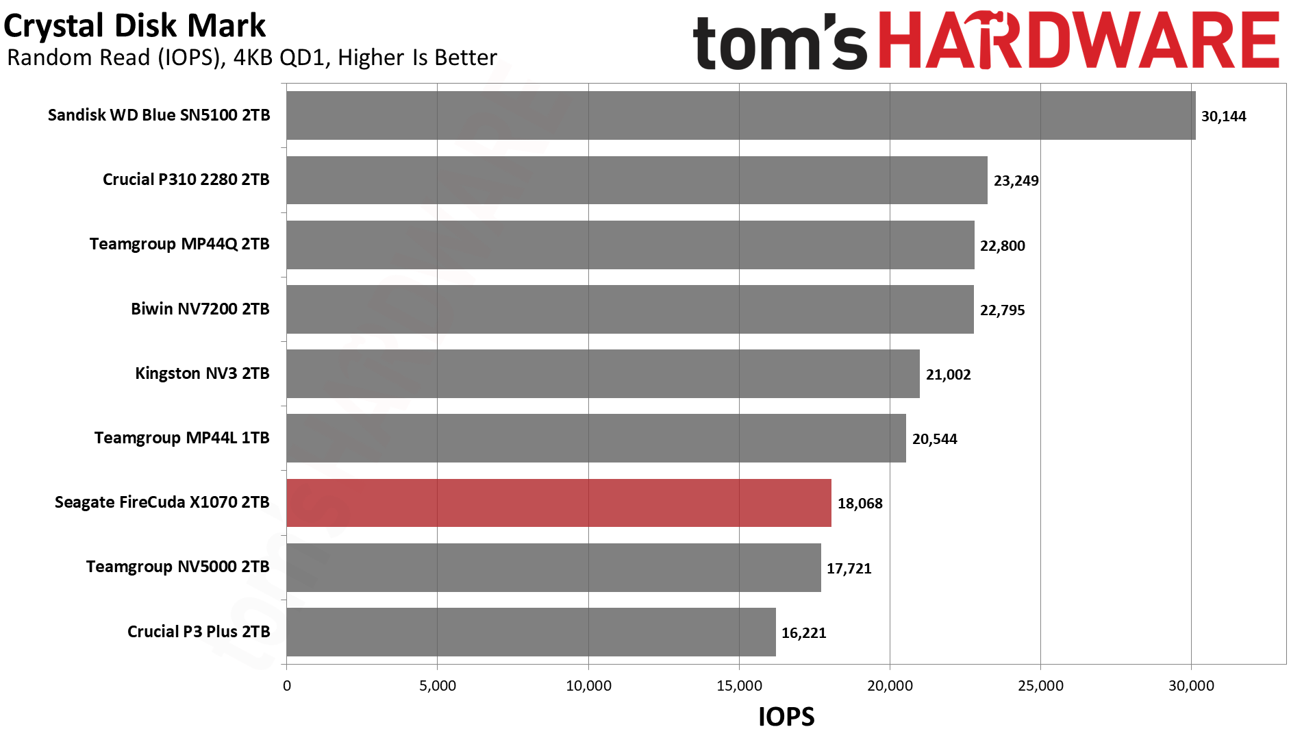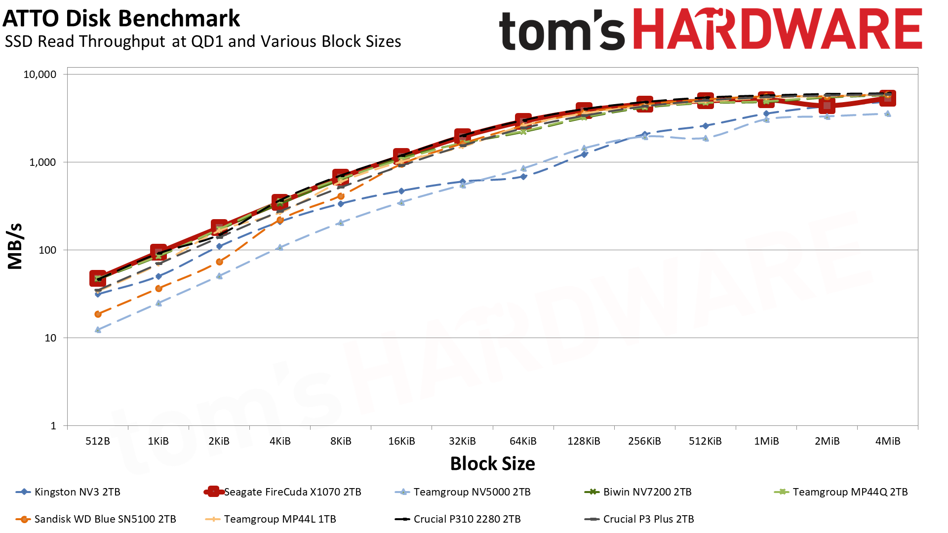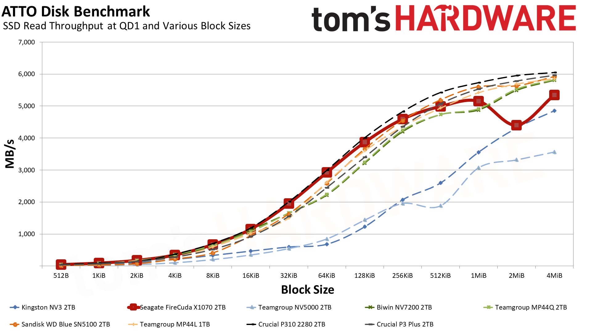Это говорит о том, что в данном тесте решает чистая линейная скорость, а не сложность контроллера. Накопители, способные стабильно гонять потоки данных, вырываются вперёд — это же справедливо для P310 и SN5100. При этом SN5100 тащит за счёт новейшей памяти BiCS8 QLC, а P310 просто шикарно оптимизирован. FireCuda X1070 попадает в плотную группу хорошистов, а значит, система на нём будет летать куда бодрее, чем на дисках прошлых поколений.
