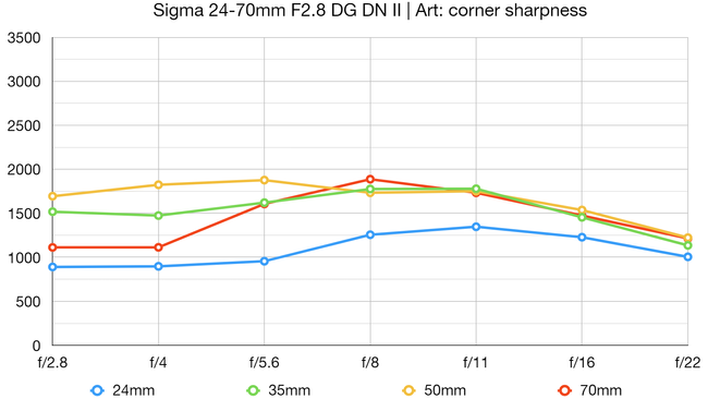 Мы были бы впечатлены такими показателями резкости в центре, если бы они были получены с помощью объектива с фиксированным фокусным расстоянием. Учитывая, что они получены с помощью зум-объектива, Sigma Mark II демонстрирует просто выдающиеся результаты даже на открытой диафрагме и при всех фокусных расстояниях.