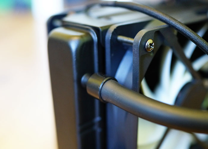 Кстати, вентиляторы используют надежные гидродинамические подшипники с большим сроком службы, а регулировка их оборотов (в диапазоне от 500 до 1350 об/мин) осуществляется методом широтно-импульсной модуляции в зависимости от нагрузки на процессор. Вместе они создают внушительный воздушный поток, который охлаждает не только радиатор и водоблок установленный на ЦП, но и расположенные поблизости силовые элементы материнской платы, а также микросхемы памяти.