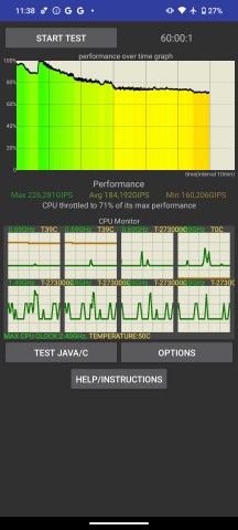 В стресс-тесте процессора устройство постепенно проседало до 71 % от его теоретической производительности, но без резких скачков частоты ядра, обеспечивая плавный геймплей даже в продолжительных игровых сессиях.