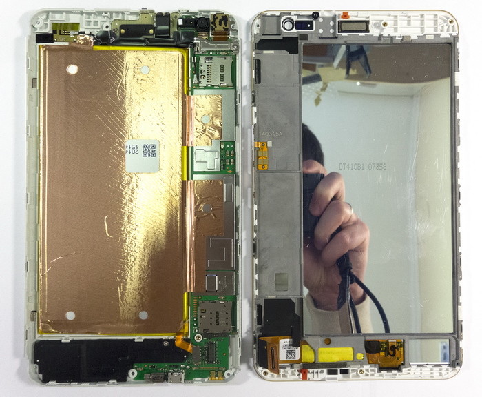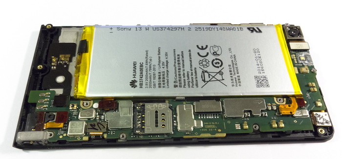 Перед тем, как включить смартфон, я отнес его к мастеру Левченко на потрошение. Оное не выявило ничего необычного. Начинка очень похожа на ту, что используется в P6. Батарея вообще та же, а экран для SoC имеет характерную выпуклость, необходимую для P6, где процессор из-за старой 40-нанометровой технологии производства сильно выступает над платой. Здесь все сделано более изящно, но выпуклость осталась.