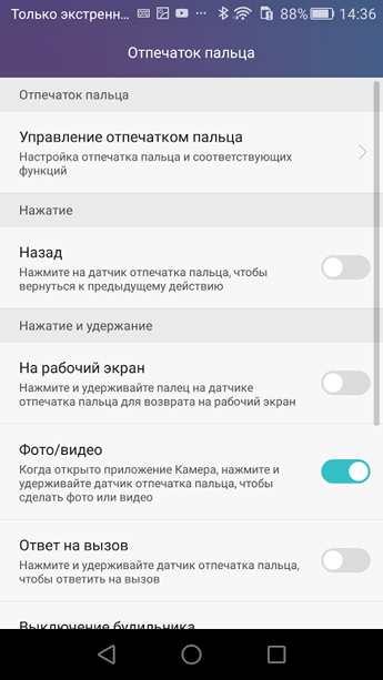 Может, это на первый взгляд и непривычно, зато удобно – когда держишь телефон в руке, то указательный палец точно попадает на площадку сканера. Вбить свои данные просто, Honor 5X запомнит палец всего за 6 касаний. На фоне Samsung Galaxy A7, где для такой же операции нужно сделать штук 30 аналогичных действий, это прогресс. Сканер помогает разблокировать смартфон, с его помощью можно выключить будильник, использовать его в качестве затвора для камеры.