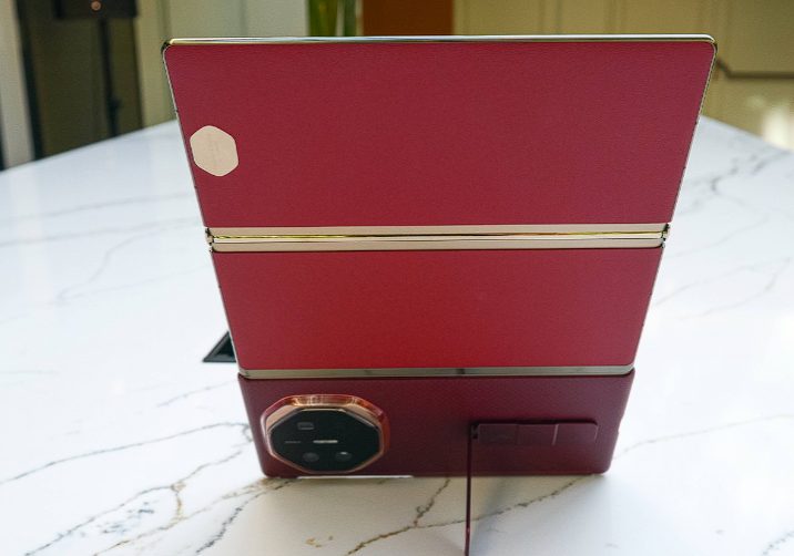 Huawei Mate XT Ultimate полностью изготовлен из премиальных материалов: сверхтонкая закруглённая металлическая рамка, петли из нержавеющей стали и корпус камеры из нержавеющей стали. Задняя панель покрыта красной или чёрной веганской кожей, а внутри трёхслойного экрана находится ультратонкое стекло.