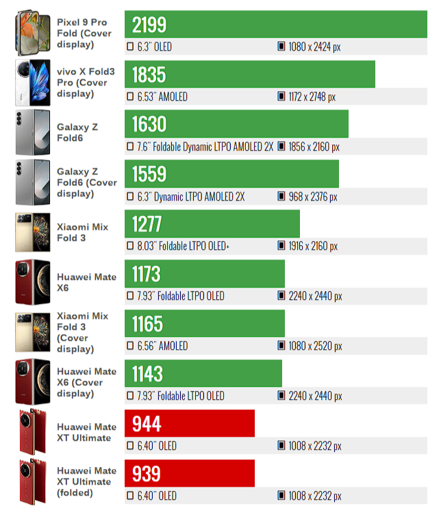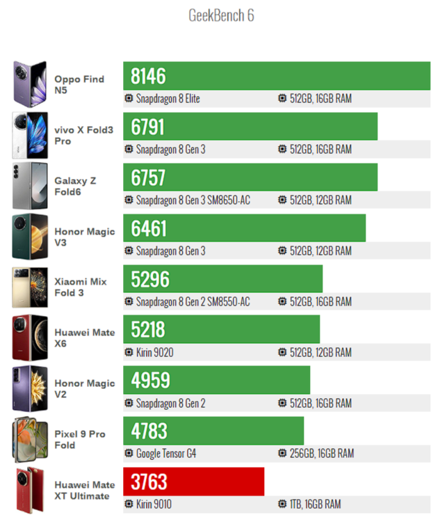 Как и ожидалось, Mate XT в лучшем случае обеспечивает производительность среднего уровня и уступает Mate X6, потому что чипсет XT на поколение старше.