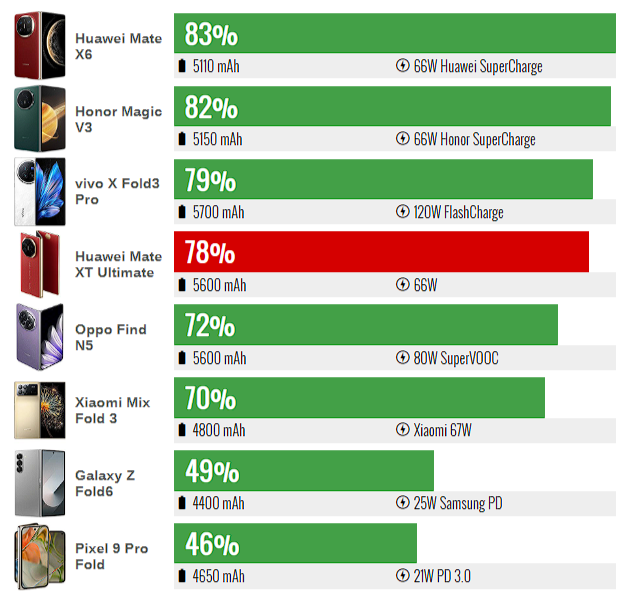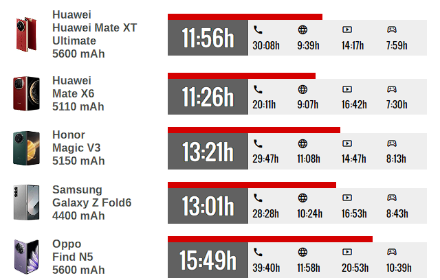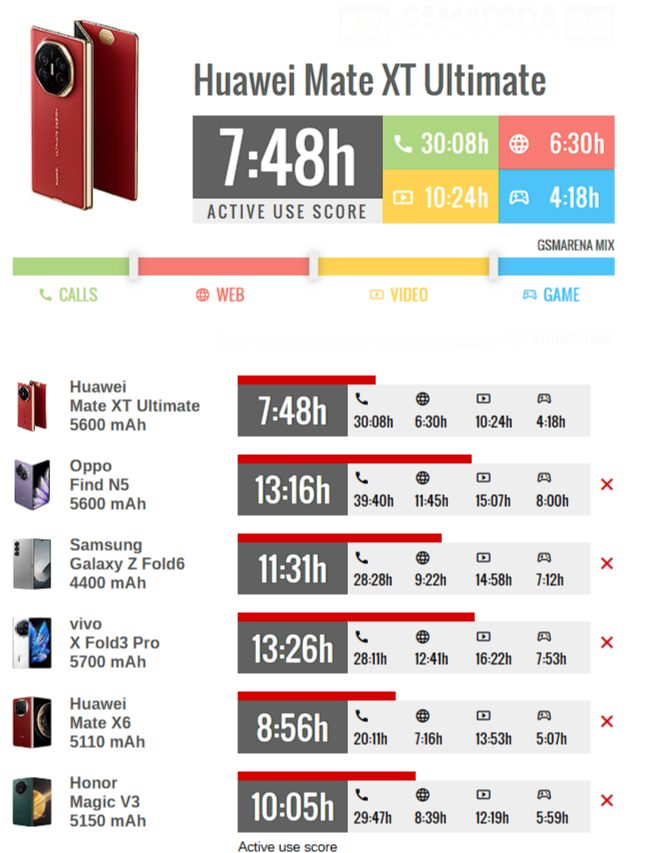 Mate XT Ultimate показал довольно неутешительный результат в 7:48 часов активного использования для своего 10,2-дюймового дисплея — можно даже сказать, что это плохо. С другой стороны, по сути, это планшет с аккумулятором размером со смартфон, так что, возможно, необходима некоторая корректировка.