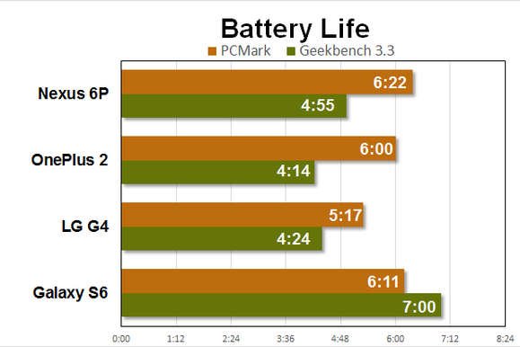 Тесты батареи Nexus 6P показывают, что ее возможности превосходят большинство аккумуляторов других флагманских устройств, особенно если они находятся в том же ценовом диапазоне. В тестах PCMark батарея 6P емкостью 3450 миллиампер-час продержалась 6 часов и 22 минуты – примерно на час меньше, чем аккумулятор Note 5 емкостью 3000 миллиампер-час. Я думала, что результаты Nexus 6P окажутся выше, потому что телефон легко выдерживал целый день интенсивного использования, но последние модели Samsung являются безусловными фаворитами в этих тестах. В реальной же жизни к 6P претензий не было. У меня устройство продержалось целый день без перезарядки в достаточно жестких условиях эксплуатации.