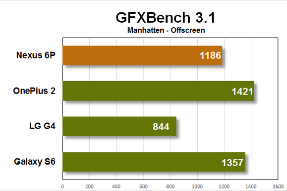 В тесте GFXBench 3.1 оцениваются возможности трехмерной графики. Тут Nexus 6P опять отстал от OnePlus 2 и Galaxy S6. Худший же результат, как и ожидалось, показал LG G4 с маломощным процессором Snapdragon 808