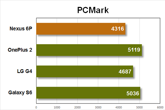 Тесты PCMark, моделирующие повседневное использование смартфона: просмотр веб-страниц, редактирование документов и пр. По совершенно загадочным причинам, точно такой же процессор Snapdragon 810 в устройстве OnePlus 2 оказался значительно быстрее