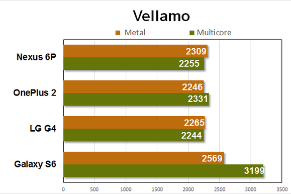 В тестах Vellamo проверяются возможности процессора. И здесь однокристальная система Qualcomm, установленная в Nexus 6P, существенно уступила процессору Galaxy S6