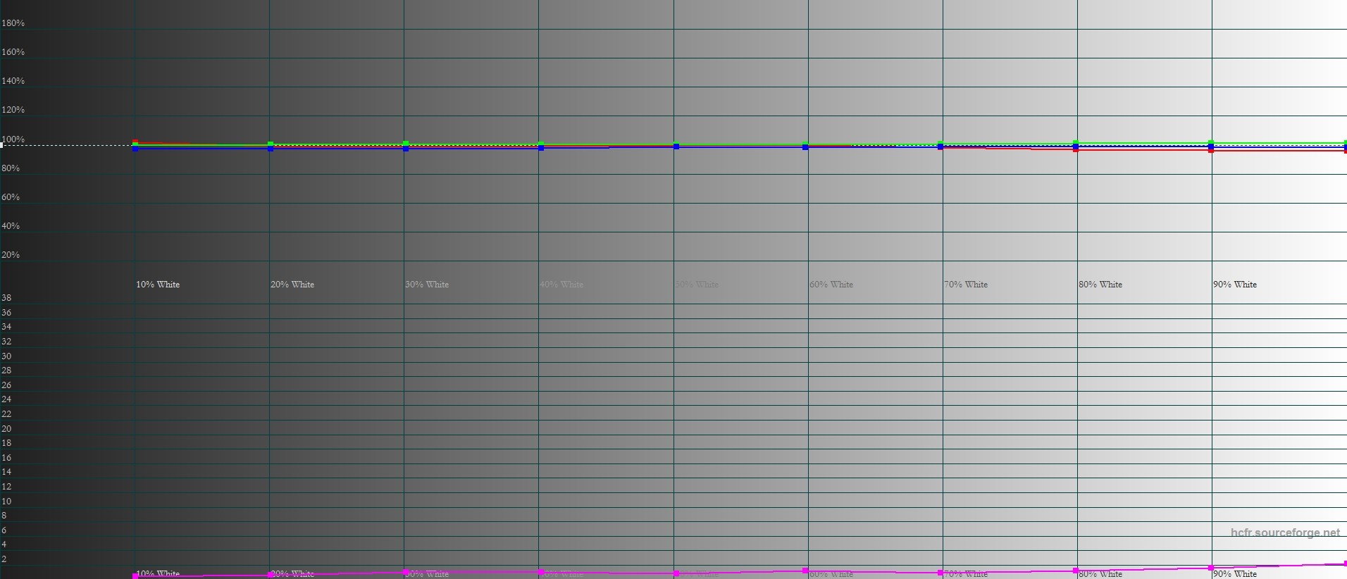 Цветовой охват и цветовая температура близки к оптимальным при включенном профиле Естественные цвета (sRGB), и рекомендуется пользоваться им. При профиле Насыщенные цвета цветовой охват экрана уже заметно смещен по отношению к охвату пространства DCI-P3, но для просмотра фильмов профиль подходит хорошо.