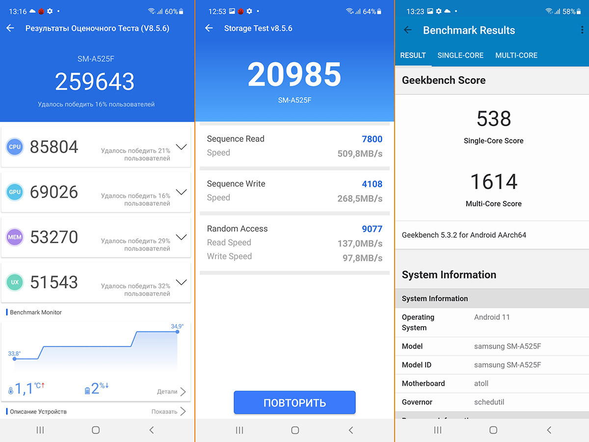 Официально в России будут продаваться версии смартфона с 4/128 ГБайт и 8/256 ГБайт памяти. Второй вариант смотрится лучше, ведь 4 ГБайт даже быстрой оперативной памяти никого не удивишь, с учетом немалой стоимости аппарата. Работает Galaxy A52 на свежей версии Android 11 с фирменной оболочкой One UI 3.1, и производительности смартфона хватает для решения многих задач, кроме запуска некоторых тяжелых игр. Значительного троттлинга и существенного нагрева корпуса при комнатной температура 21 градусах по Цельсию не выявлено.