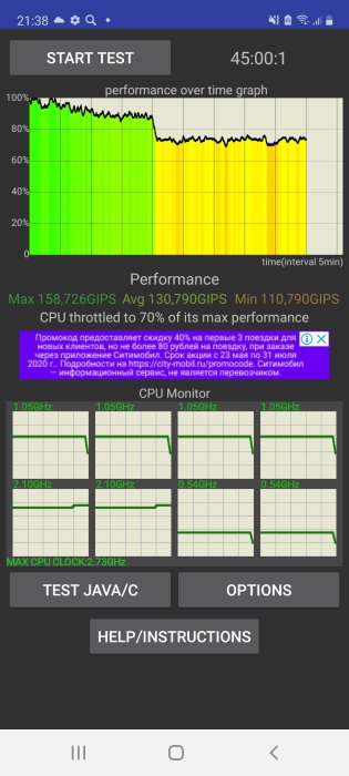 В некоторых синтетических тестах смартфон ощутимо нагревается, да и в играх тоже можно пальцами почувствовать заметное тепло как на задней стороне аппарата, так и в верхней части передней стороны, то есть на дисплее. Вроде бы это не критично, но нужно учесть, что тестирование проводилось в довольно прохладном помещении. При этом еще наблюдается троттлинг при длительных нагрузках.