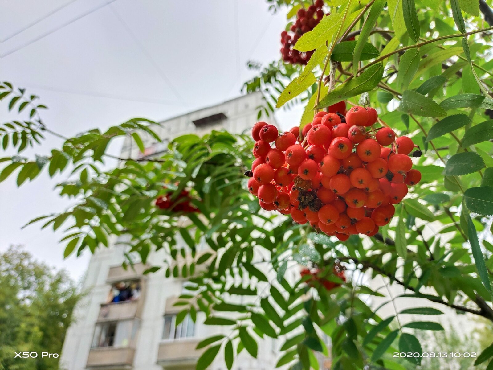 Камера отлично справляется и при слишком ярком свете, обеспечивая широкий динамический диапазон. Пейзажи с контровым освещением получаются без засветов и потери деталей. За темными ветками на освещенном заднике отлично прорисовались здания, а дождливое серое небо сохранило свой естественный цвет даже в соседстве с ярко красными ягодами рябины.