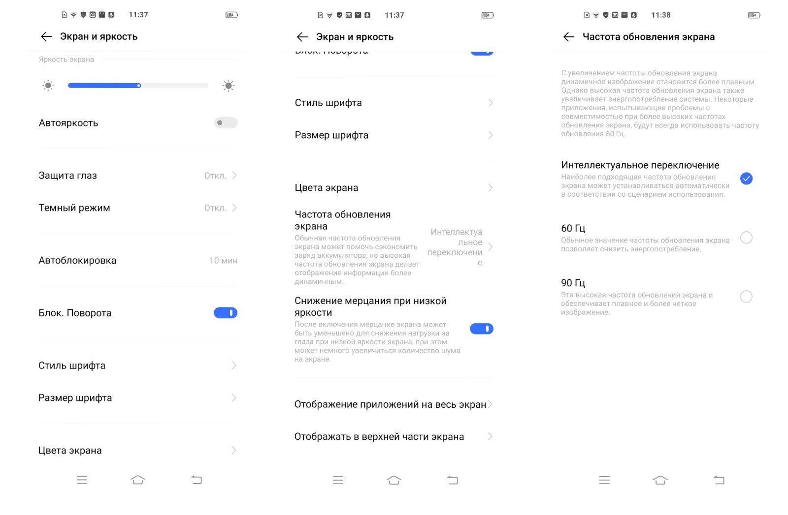 Частота обновления дисплея — 90 Гц, что делает немного более комфортным просмотр новостной ленты и соцсетей. Изменить ее можно в настройках, где предлагается три варианта: 60 Гц, 90 Гц или интеллектуальное переключение, когда смартфон сам выбирает, какую частоту обновления экрана выбрать, исходя из сценария использования. В настройках также можно задать режим защиты глаз по расписанию, включить темный режим и снизить мерцание — классическая проблема AMOLED-дисплеев. Индивидуальными настройками температуры экрана с помощью теплового круга разработчики пренебрегли, ограничившись движком от холодного к теплому тону.