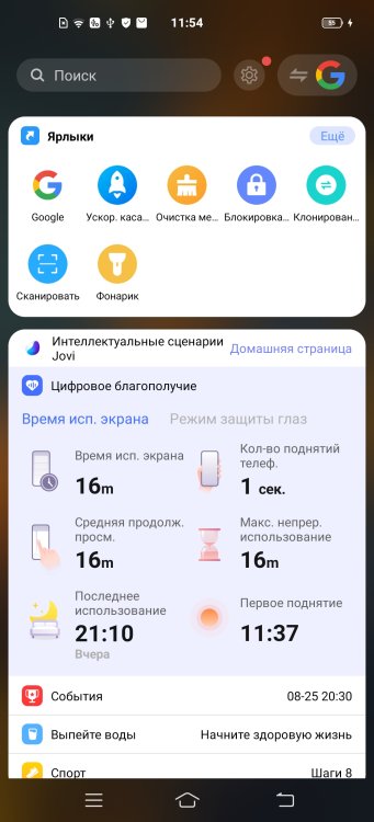 На смартфоне установлен Android 10 и фирменная прошивка Vivo – Funtouch OS версии 10.5, в которой традиционно есть всяческие полезности. Например, есть возможность перевода телефона одной кнопкой в специальный детский режим, с доступом по умолчанию только к медиафайлам и камере и возможностью добавления других приложений. Интеллектуальные сценарии Jovi, содержащиеся в прошивке, позволят настроить для себя календарь спортивных событий, создать спортивный план упражнений, проконтролировать объем потребляемой воды, количество пройденных шагов и время, проведенное перед экраном телефона.