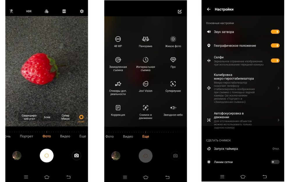 В меню есть как классические, так и неожиданные режимы съемки. Рядом с такой классикой, как замедленная съемка, интервальная съемка, панорама, живое фото, профессиональный режим, съемка с расширением 48 МР и стикеры дополнительной реальности, есть и те, что призваны подчеркнуть высокие возможности камеры с 60-кратным цифровым зумом: Суперлуние и Звездное небо (рекомендуется использовать штатив).