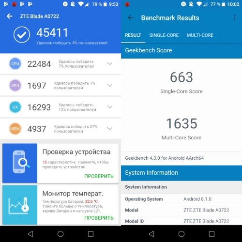 Но начнем с тестов GeekBench и AnTuTu. Как мы знаем, в ZTE Blade A7 установлен процессор Qualcomm Snapdragon 425 и 2 Гбайт оперативной памяти. В тесте GeekBench смартфон набирает 663 балла в одноядерном тестировании и 1635 баллов в многоядерном. В AnTuTu ZTE Blade A7 остановился на отметке 45411 баллов и ему удалось победить 4% остальных участников тестирования.
