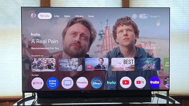 Google TV предлагает полный набор приложений для потокового вещания, которые расположены в ряд в нижней части главного экрана в настраиваемом порядке. Вкладки в верхней части главного экрана позволяют получить доступ к Live TV и экранам Sony, а также к подборке фильмов Sony Pictures Core и обучающим видео по управлению телевизором.