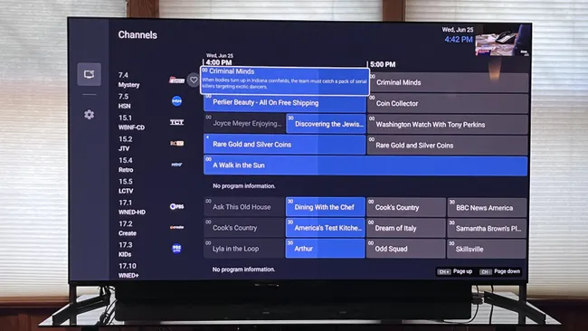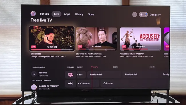Экран Live TV заслуживает отдельного упоминания, поскольку он отлично интегрирует бесплатные телевизионные каналы с рекламой (FAST) от Google Freeplay с каналами эфирного телевидения, которые подключаются через тюнер ATSC 3.0. Как каналы FAST, так и каналы эфирного телевидения можно просматривать в сетке программ с привязкой ко времени, при этом для каждого канала предоставляется информация о программе.