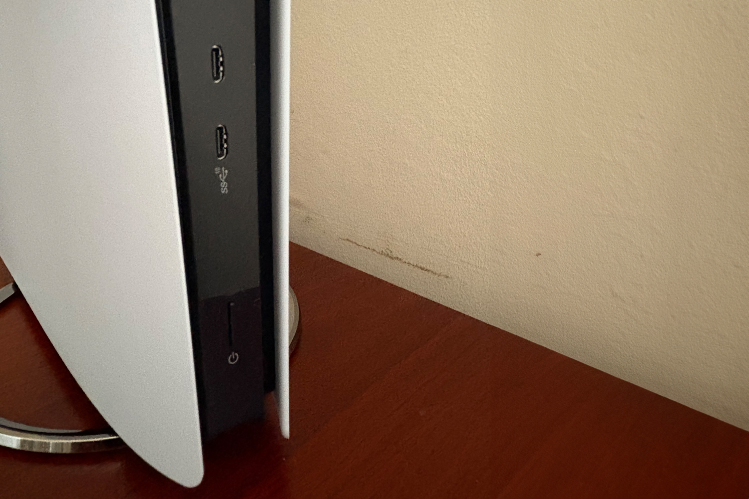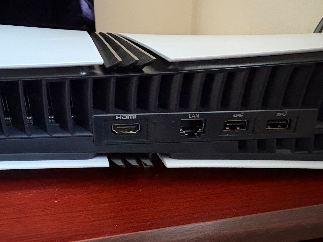 Сама консоль по-прежнему имеет тот же глянцевый чёрный пластиковый корпус, что делает её магнитом для пыли и отпечатков пальцев. Я ожидаю, что на ней так же легко будут оставаться следы, если вы будете регулярно пользоваться её USB-портами. PS5 Pro, как и PS5 Slim, оснащена двумя USB-C спереди и двумя USB-A сзади; это связано с тем, что всё больше устройств используют более новый стандарт, включая кабель, входящий в комплект поставки контроллера DualSense. Это невыгодно, если вы до сих пор используете старые периферийные устройства, такие как джойстики или гоночные колёса, которые нужно подключать, потянувшись за консоль.