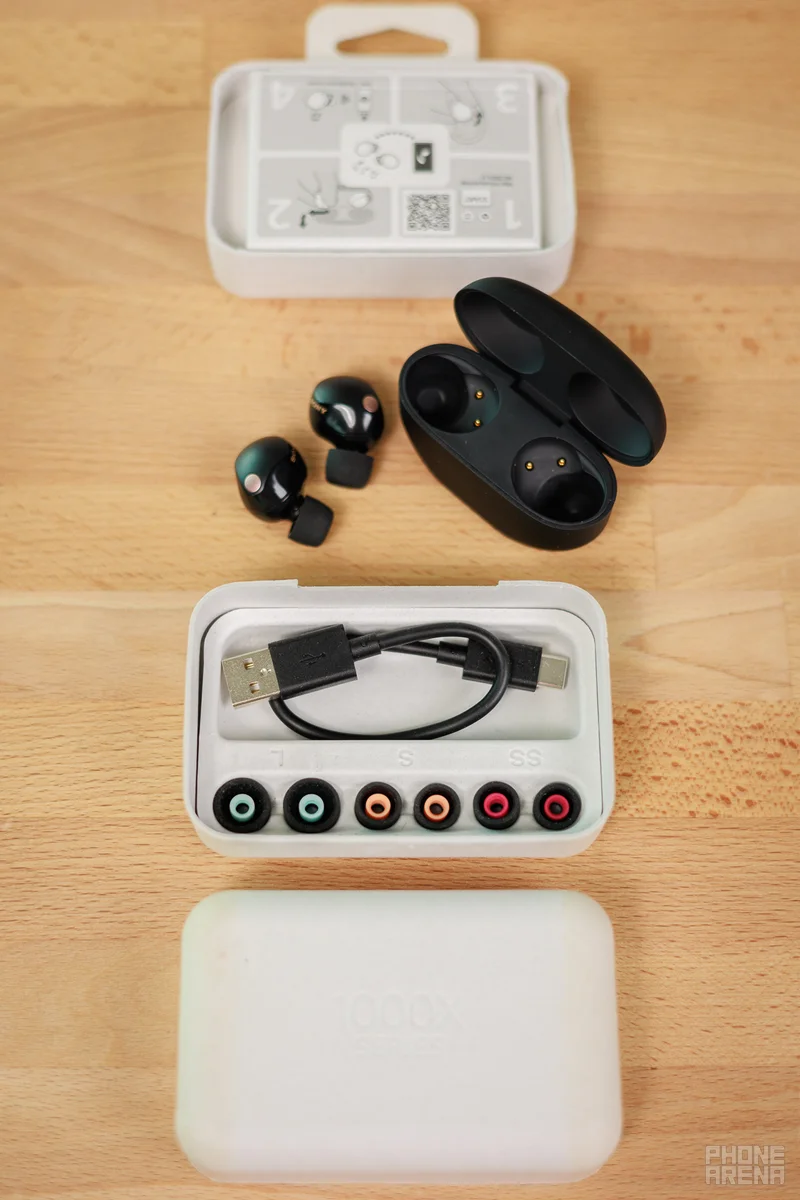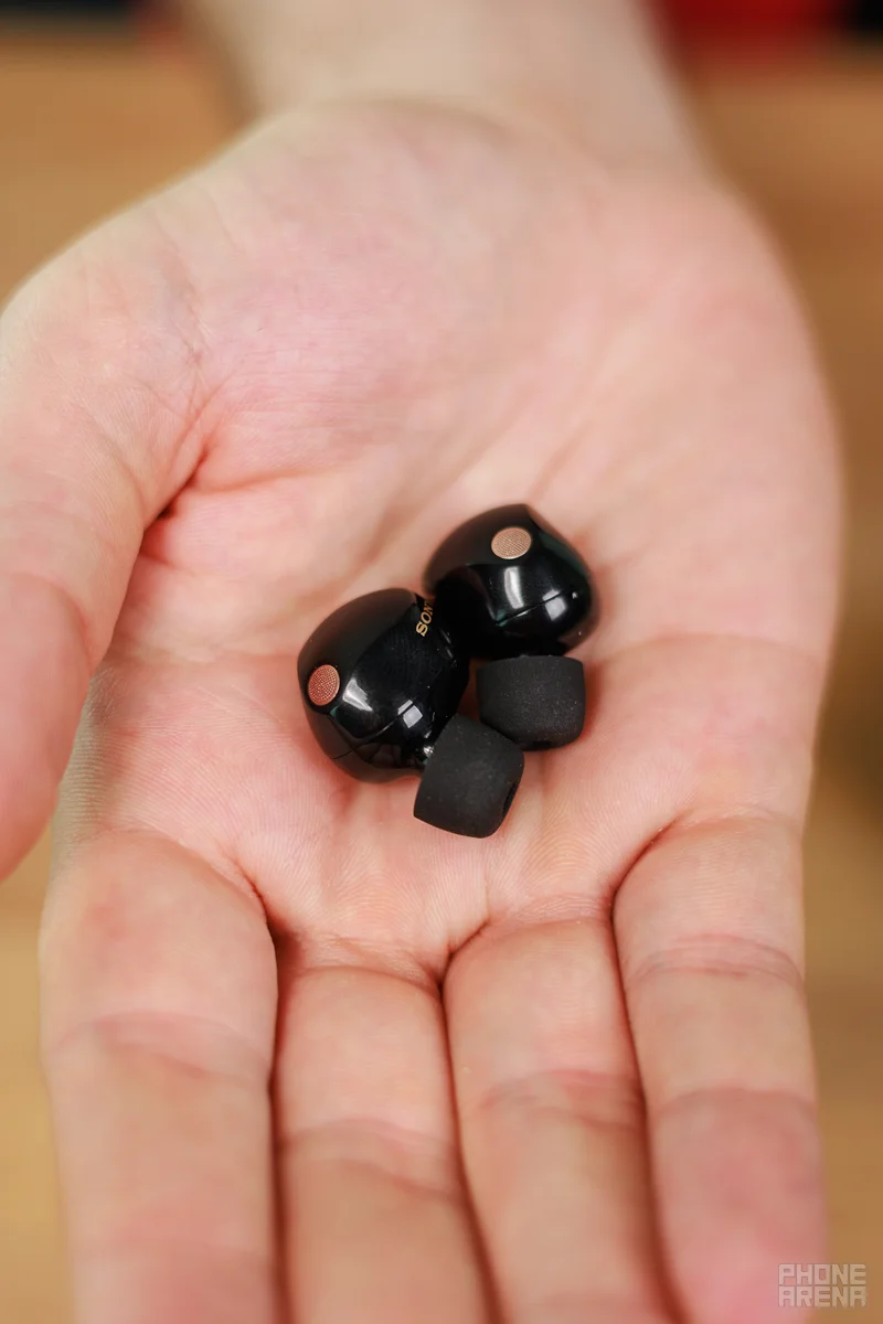 В комплект входят насадки четырёх размеров. Sony по-прежнему использует насадки из вспененного материала для своих флагманских наушников. Они могут вам понравиться или не понравиться в зависимости от ваших личных предпочтений. Насадки из вспененного материала обычно немного приглушают высокие частоты и усиливают басы. К ним также нужно привыкнуть, прежде чем вставлять их в ухо.