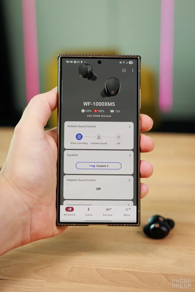 Они также поддерживают технологию Sony DSEE Extreme, которая, по сути, представляет собой алгоритм апскейлинга. Если воспроизводить через них музыку с низким битрейтом, качество звука должно улучшиться. Я слушал через них Apple Music (с телефона на Android) и включал и выключал DSEE. Не могу сказать, что я услышал какое-то значительное улучшение — может быть, немного прибавилось в басах и динамике, но это могло быть и эффектом плацебо. Возможно, он может сделать больше, если у вас есть архив старых mp3-файлов с битрейтом 128 кбит/с.
