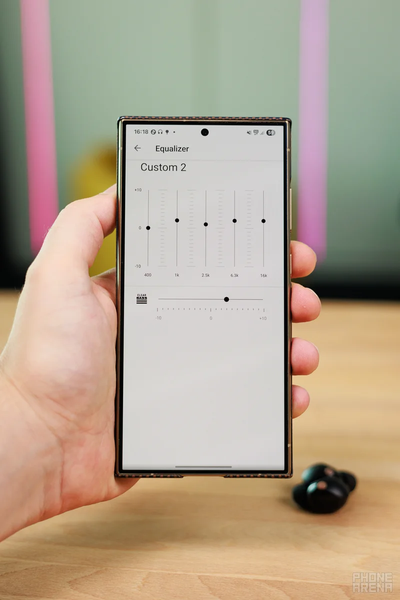Ещё одна хорошая новость заключается в том, что вы можете немного настроить эквалайзер в приложении. В нашем обзоре WH-1000XM6 я отметил, что эквалайзер флагманских наушников был улучшен и теперь поддерживает больше диапазонов. В случае с WF-1000XM5 это не так. Нет, у вас есть 5 диапазонов: 16 кГц, 6,3 кГц, 2,5 кГц, 1 кГц и 400 Гц. Все, что относится к низкочастотному диапазону, регулируется с помощью ползунка Clear Bass. Я предполагаю, что он динамически настраивает чувствительные низкочастотные диапазоны по-своему.