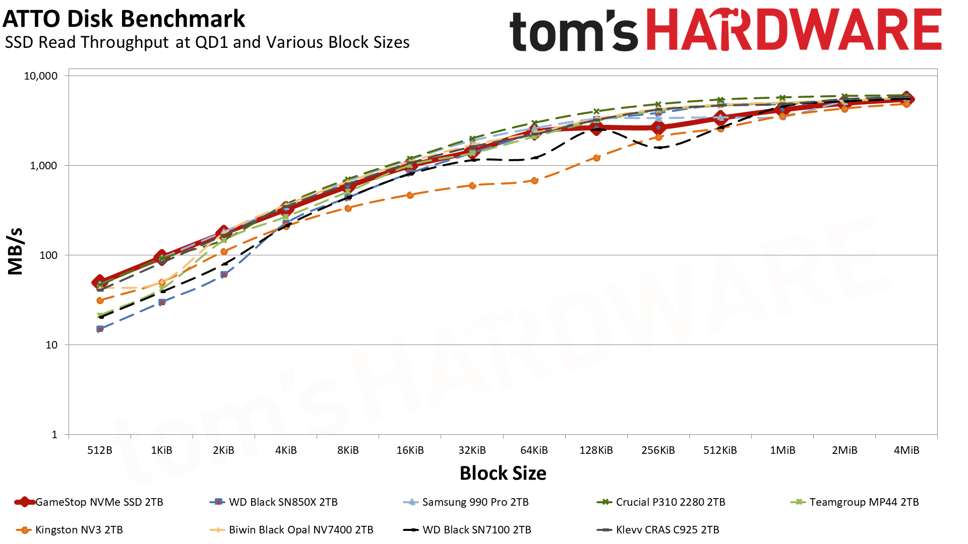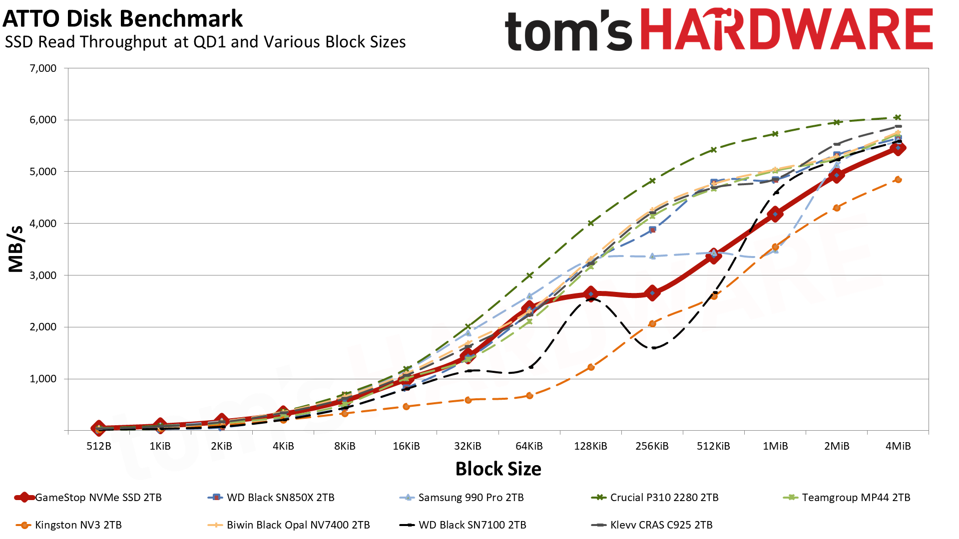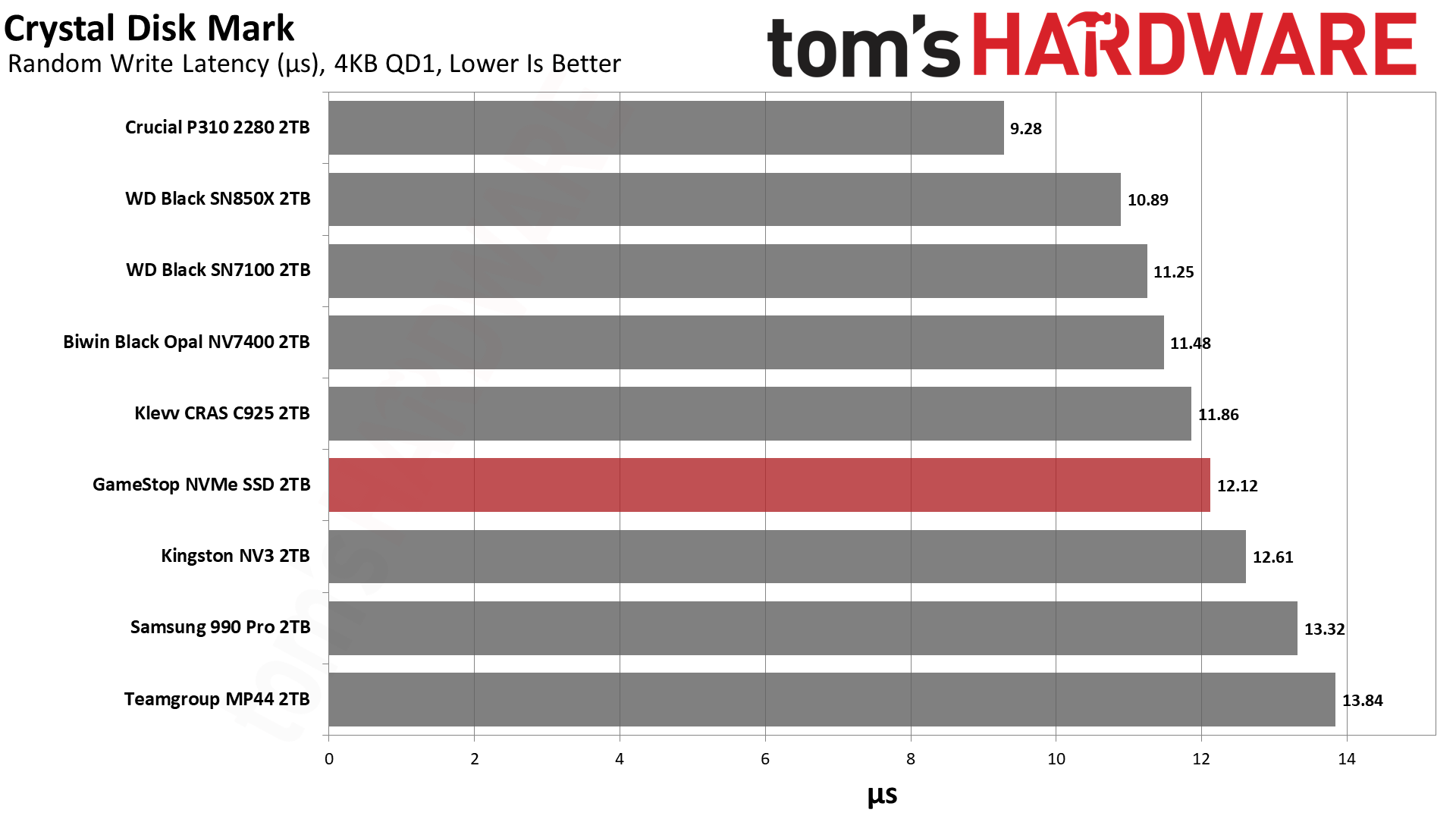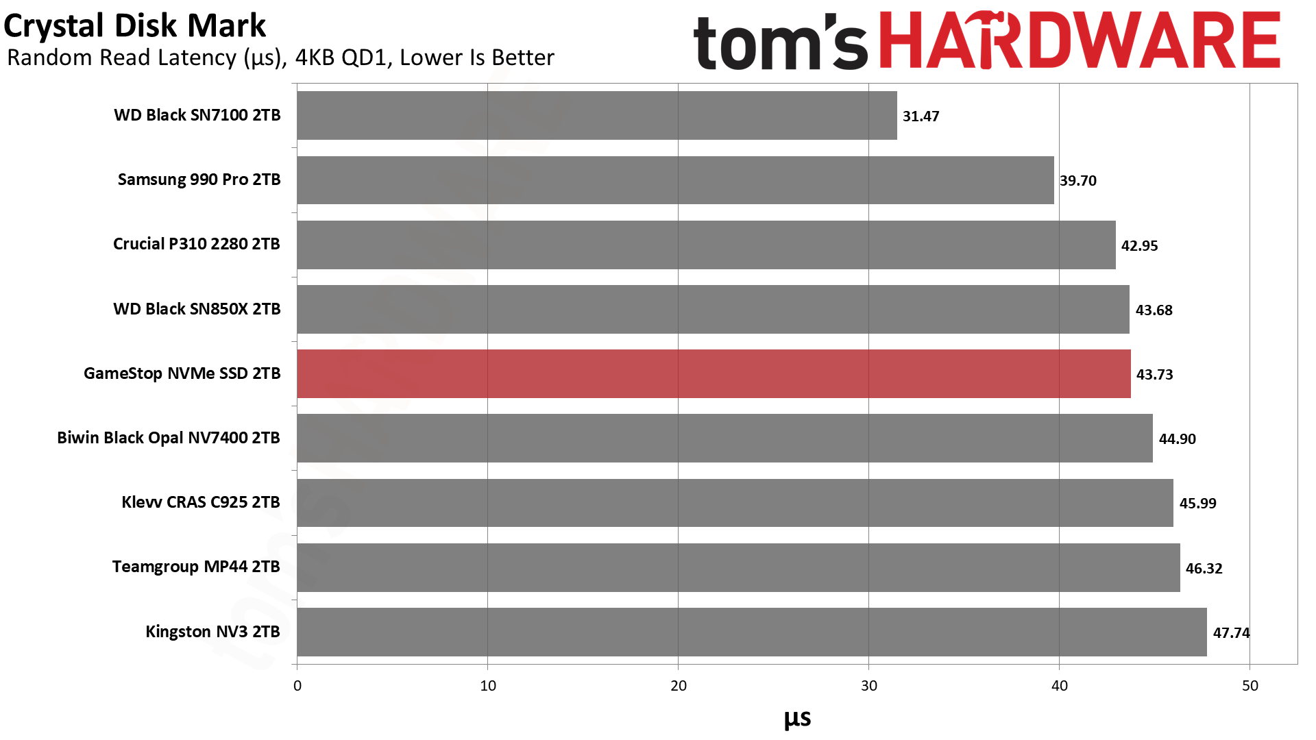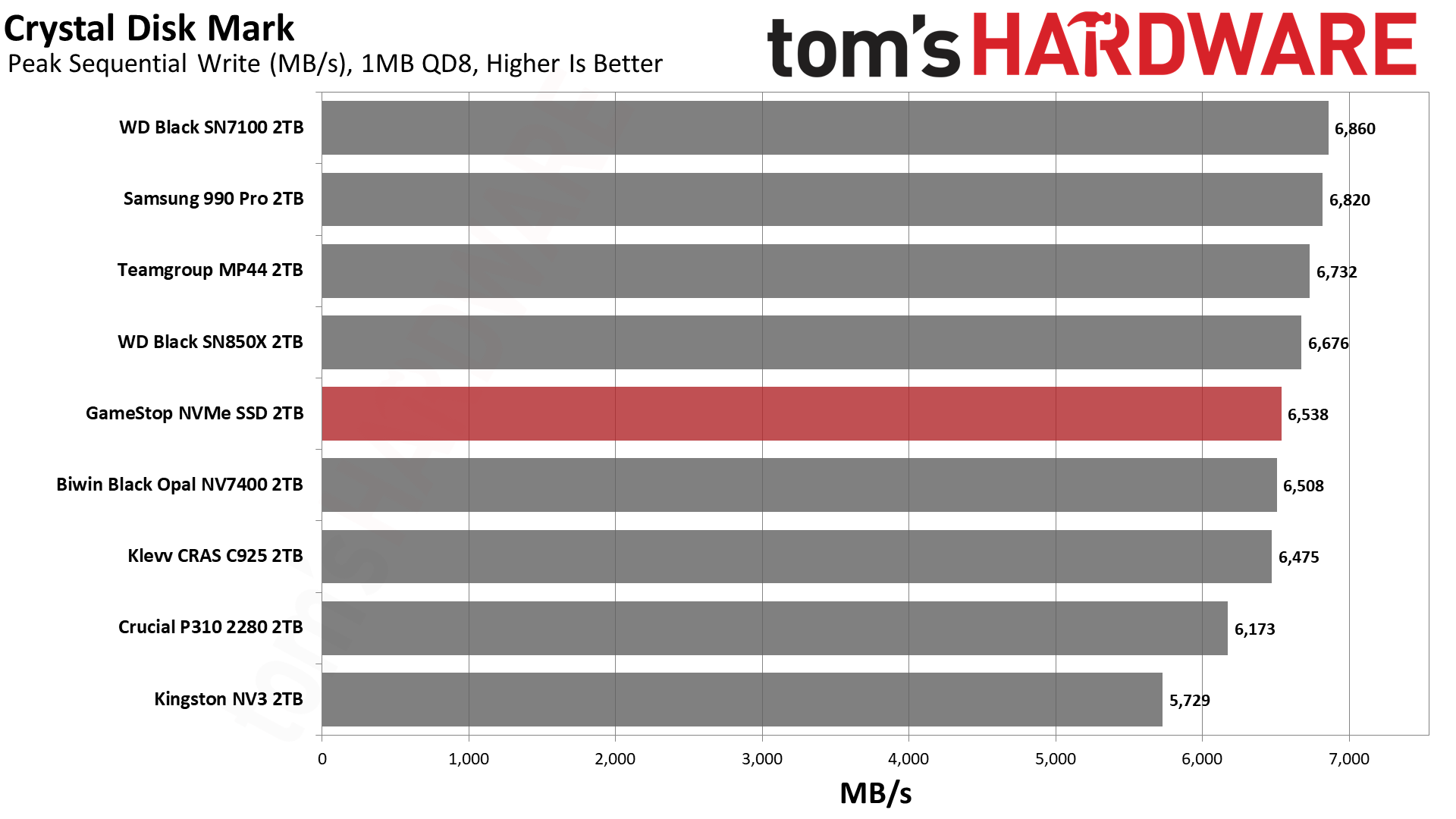 А вот тут у меня буквально отпала челюсть! GameStop умудрился обойти топовый WD Black SN850X — флагмана, на минуточку. Свежий Black SN7100 с его новой памятью все еще впереди, как и 2-терабайтный 990 Pro (который делит с нашим героем одинаковую флеш-память, но выезжает за счет злого контроллера и DRAM). Единственный, кто нагло влез вне очереди — это Crucial P310 без буфера и на QLC-памяти, но этот диск вышел позже и его прошивка вылизана до идеала.