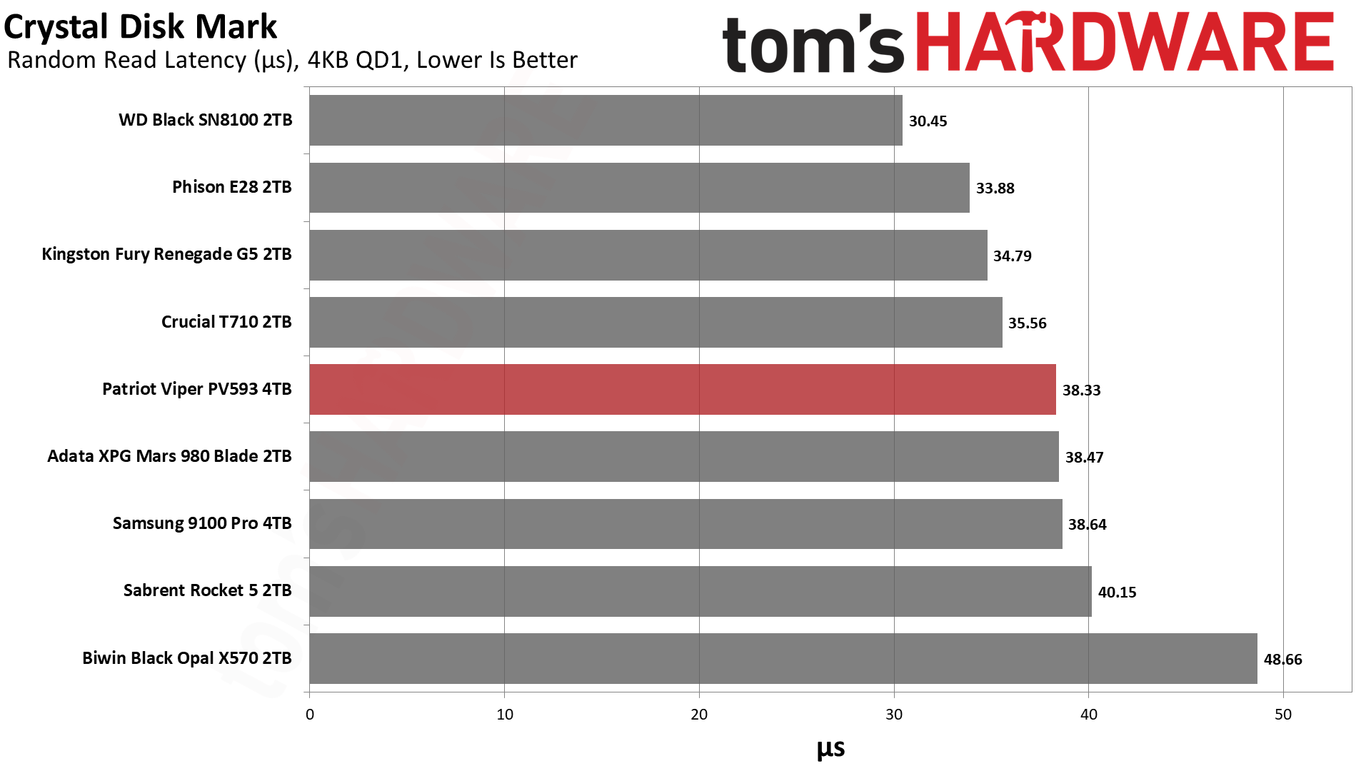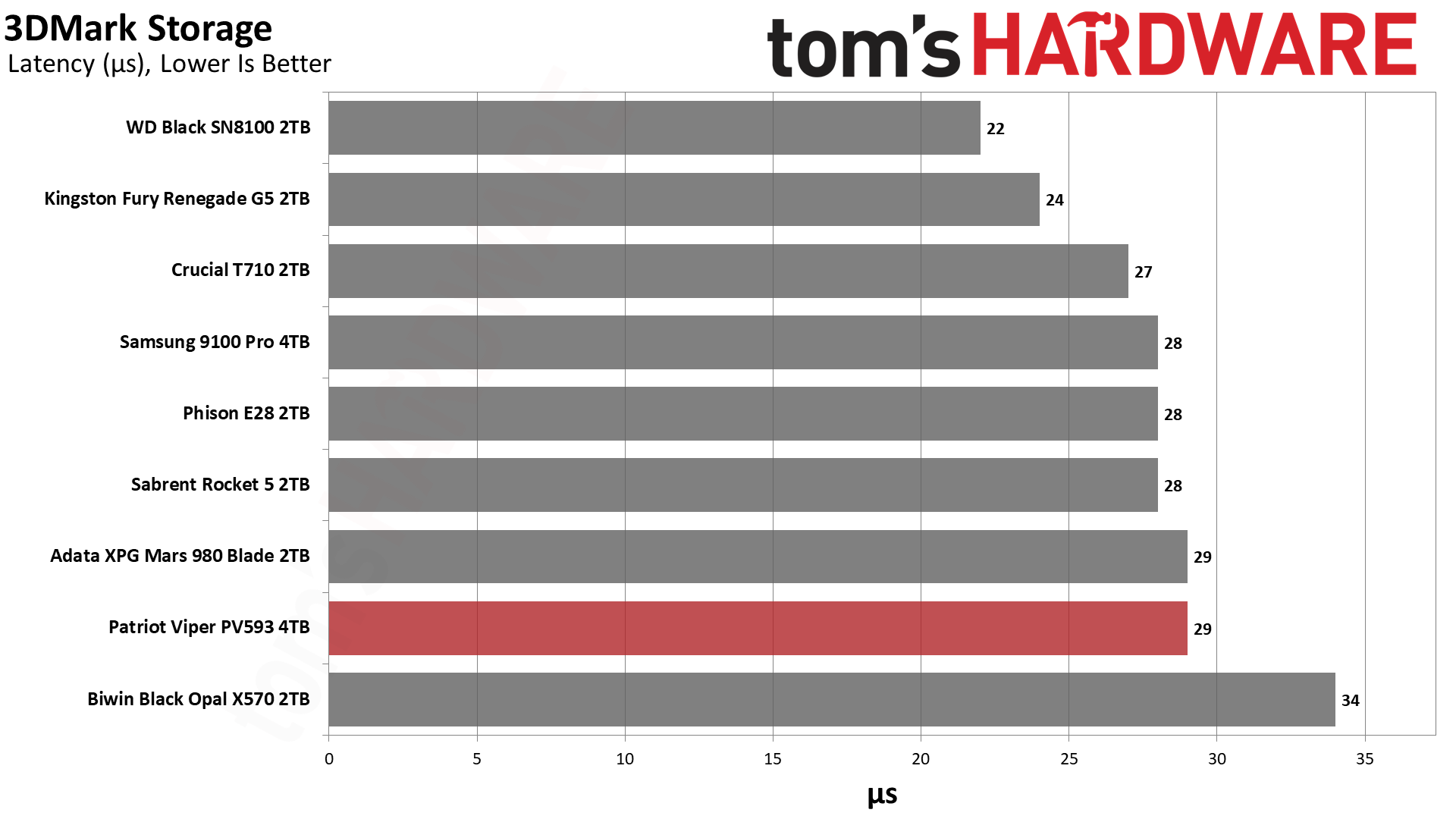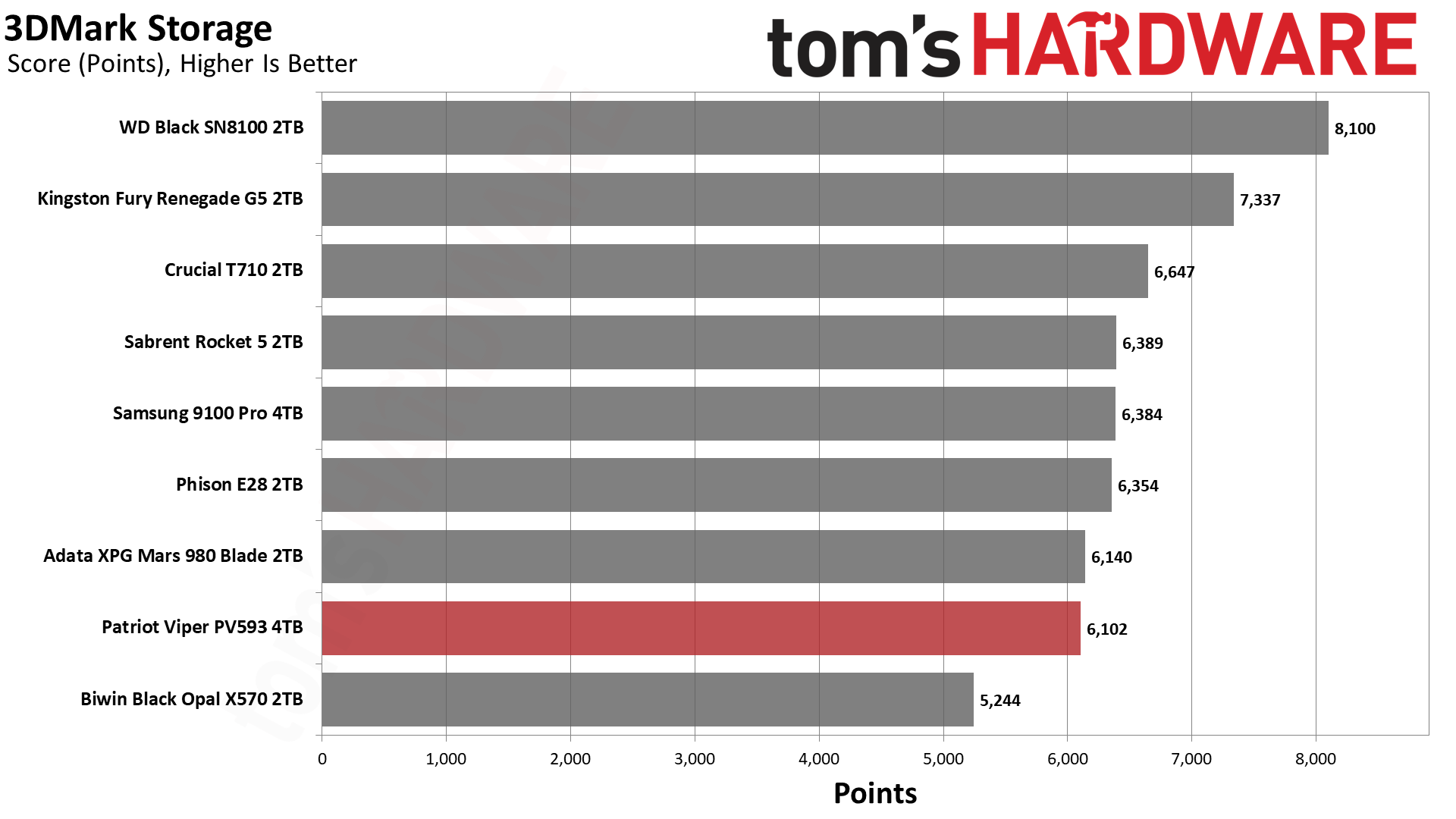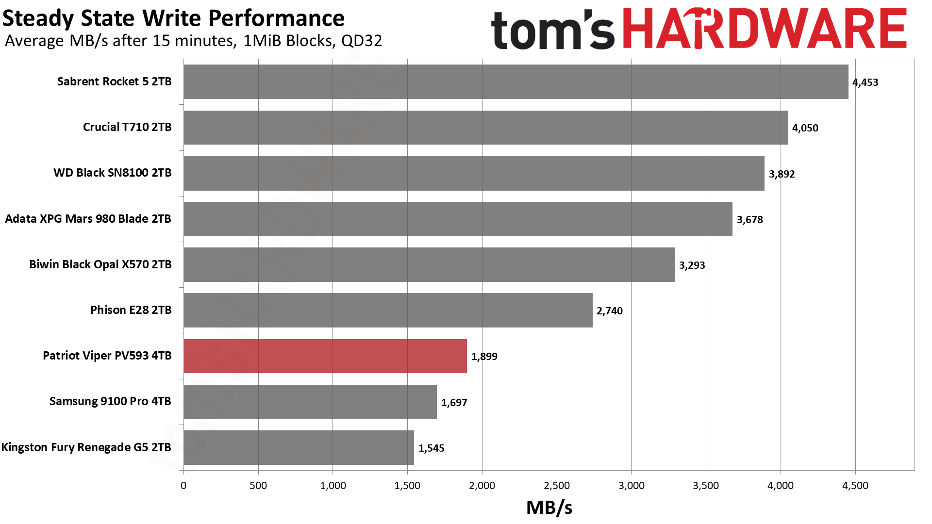 Мы тщательно подбираем накопители для сравнения, чтобы наши диаграммы были максимально наглядными и давали четкое представление о том, как конкретное устройство соотносится с конкурентами в аналогичной ценовой категории. В большинстве случаев вы вряд ли станете рассматривать 4-терабайтный Patriot Viper PV593 как способ сэкономить бюджет при сборке новейшего ПК, если только речь не идет о готовых системах. Это высокопроизводительный накопитель, и даже если он позиционируется как более доступное устройство в своем классе, вам стоит знать о любых перебоях в его работе.