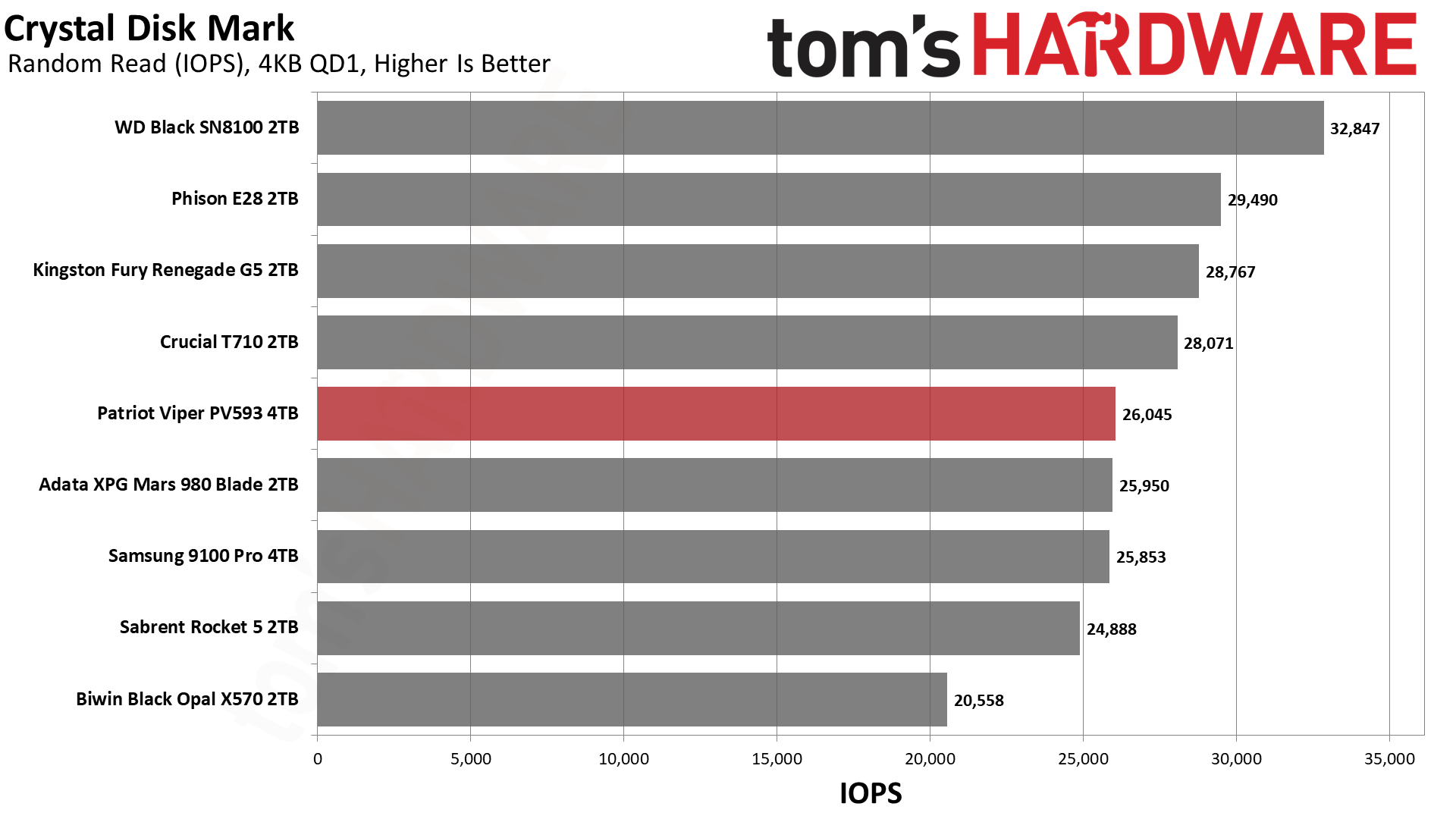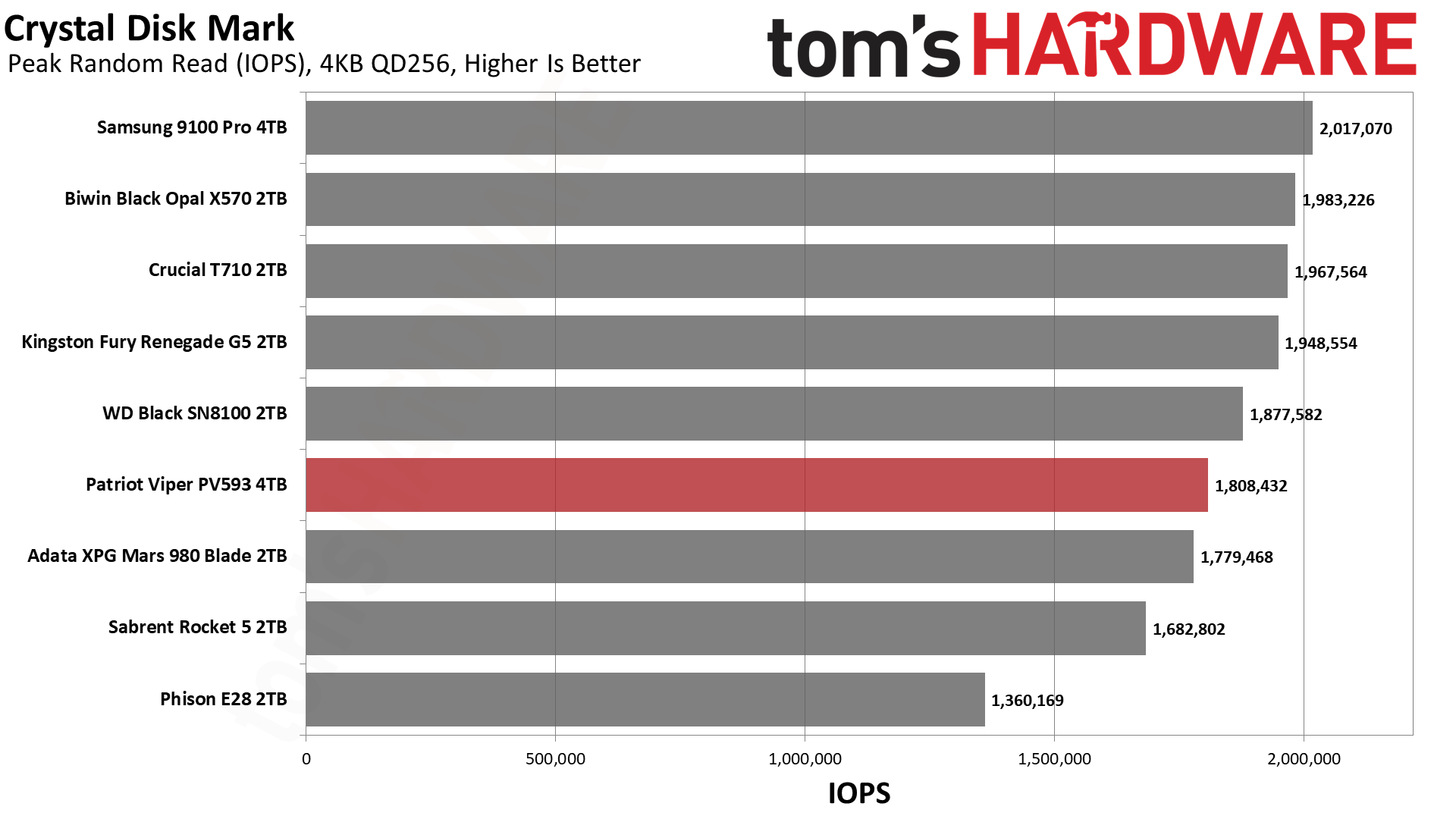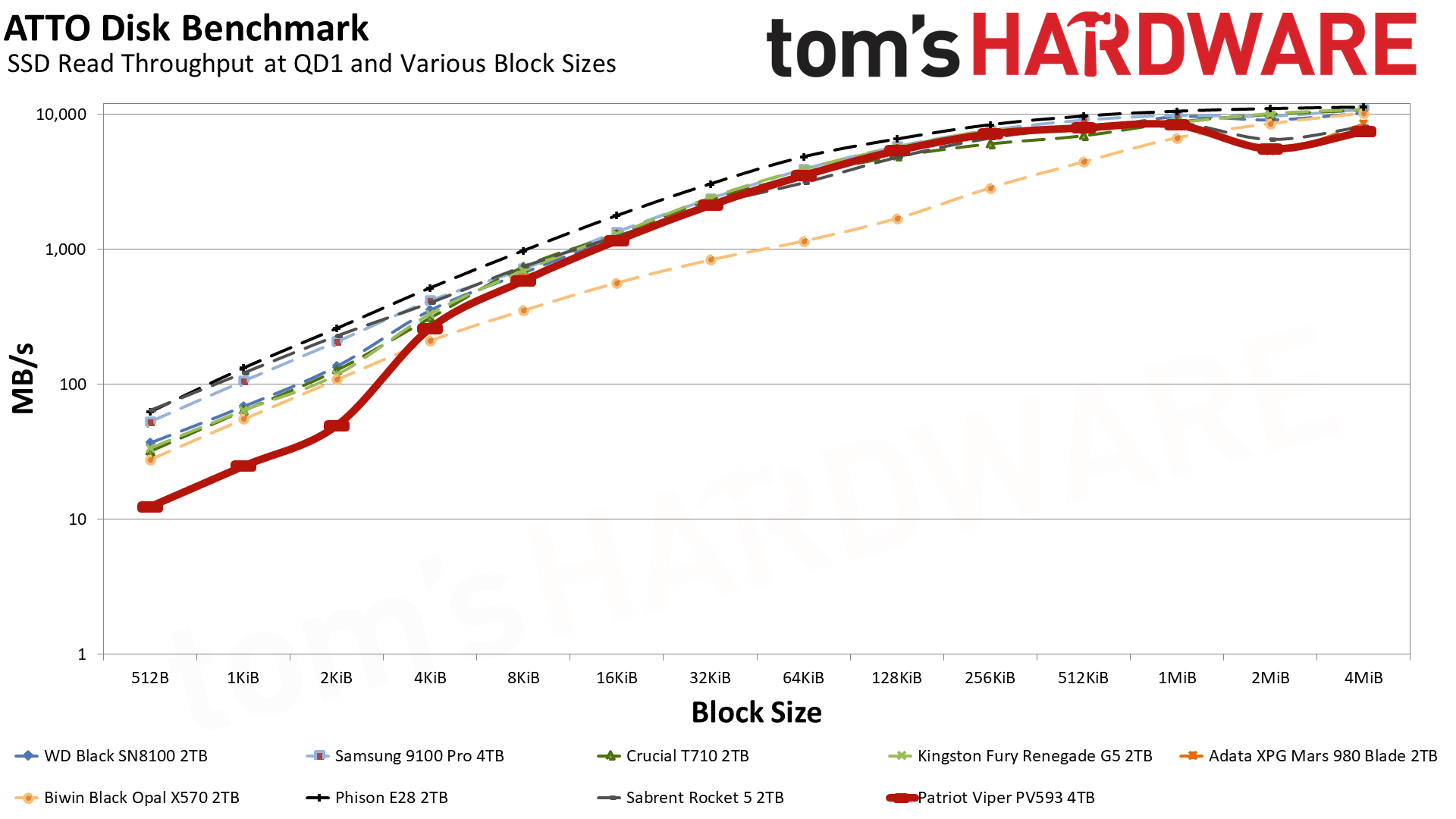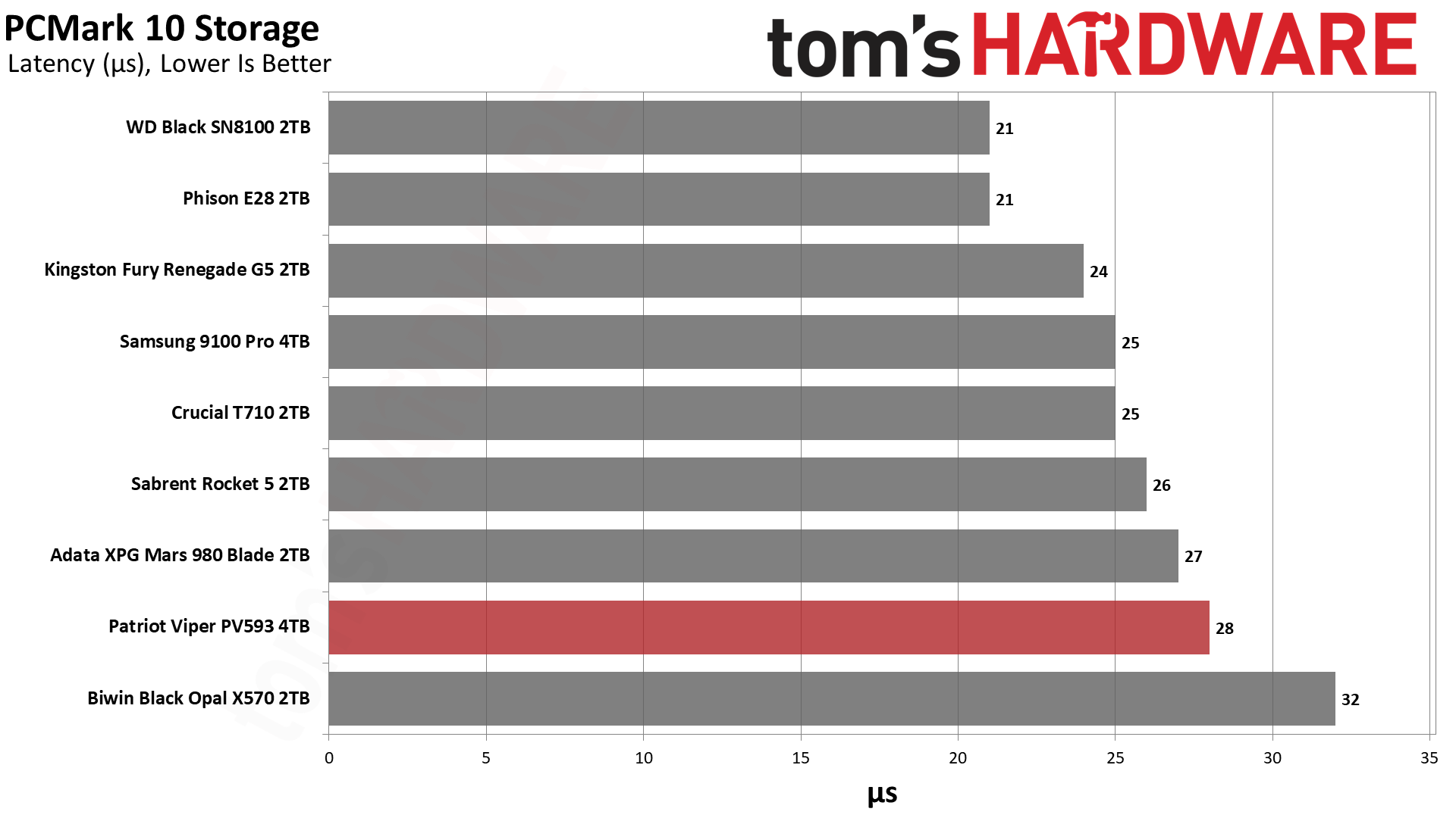 Мы тщательно подбираем накопители для сравнения, чтобы наши диаграммы были максимально наглядными и давали четкое представление о том, как конкретное устройство соотносится с конкурентами в аналогичной ценовой категории. В большинстве случаев вы вряд ли станете рассматривать 4-терабайтный Patriot Viper PV593 как способ сэкономить бюджет при сборке новейшего ПК, если только речь не идет о готовых системах. Это высокопроизводительный накопитель, и даже если он позиционируется как более доступное устройство в своем классе, вам стоит знать о любых перебоях в его работе.