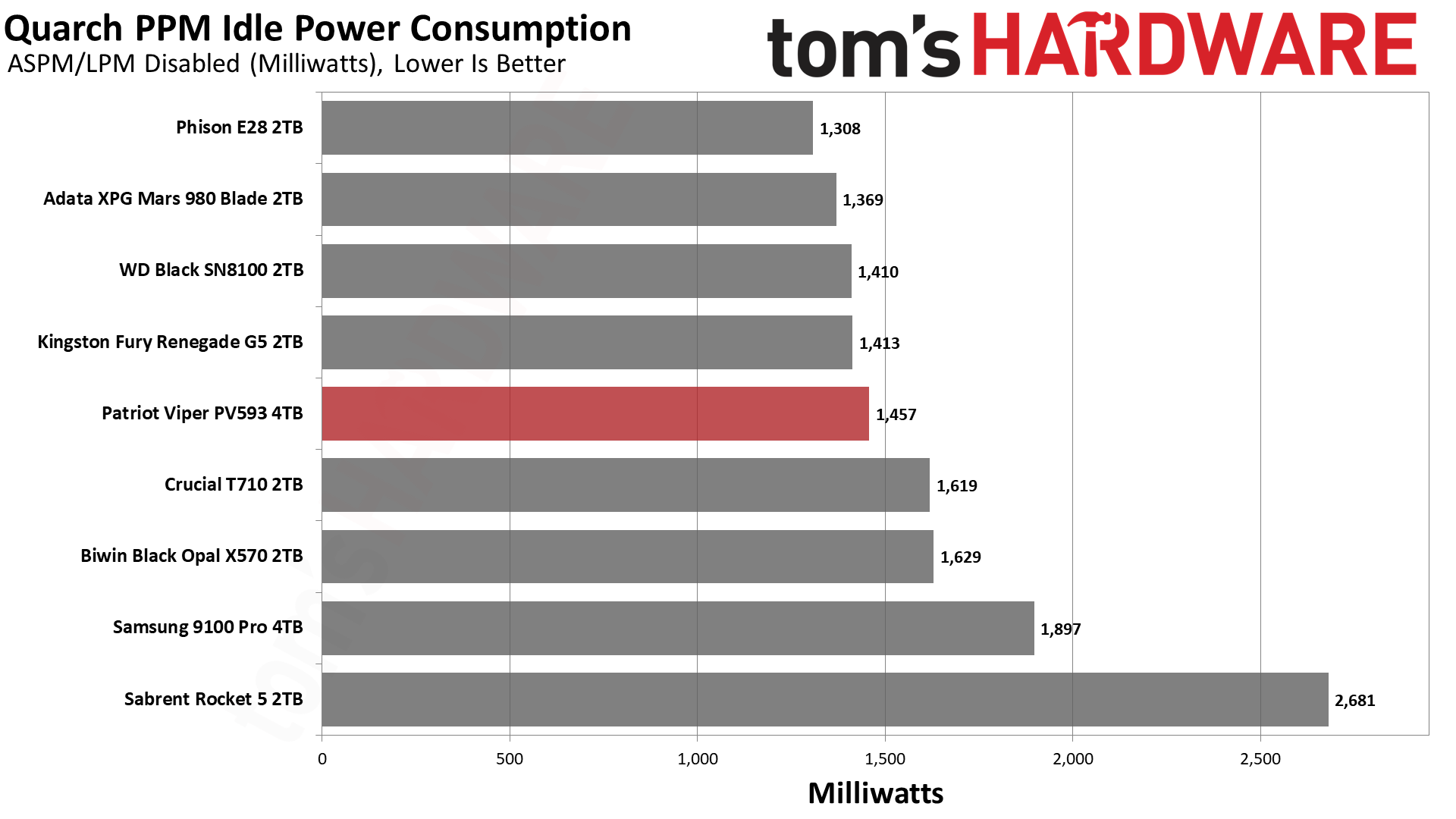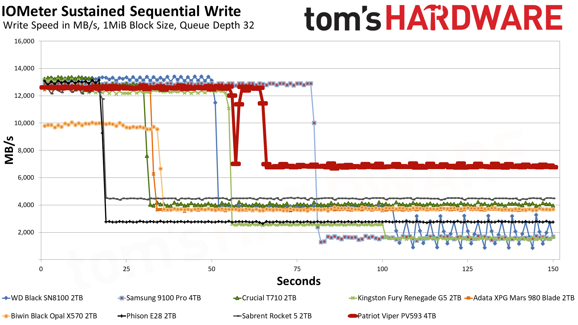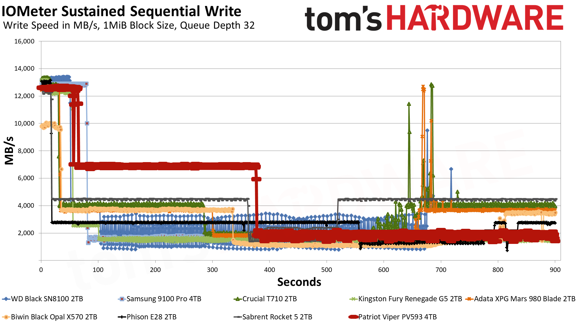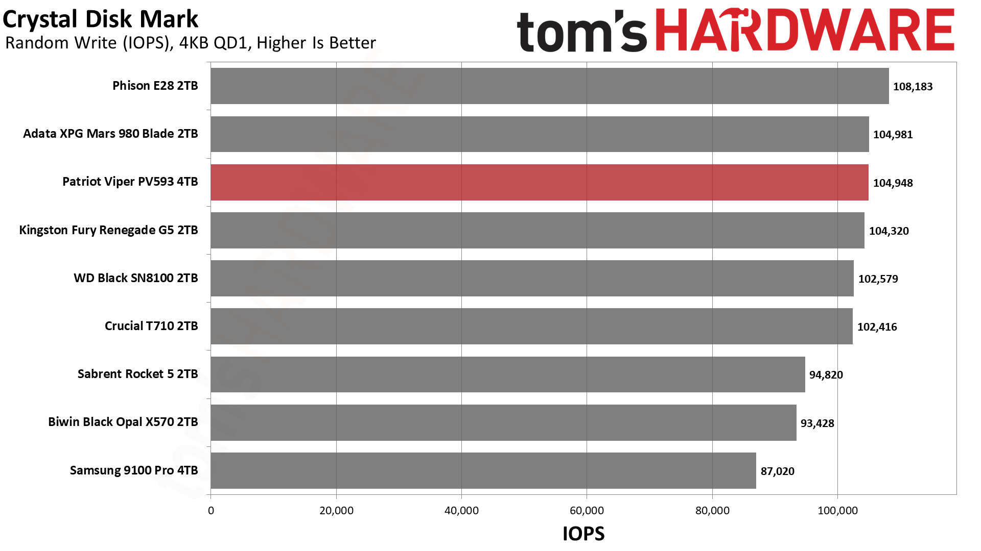 Мы тщательно подбираем накопители для сравнения, чтобы наши диаграммы были максимально наглядными и давали четкое представление о том, как конкретное устройство соотносится с конкурентами в аналогичной ценовой категории. В большинстве случаев вы вряд ли станете рассматривать 4-терабайтный Patriot Viper PV593 как способ сэкономить бюджет при сборке новейшего ПК, если только речь не идет о готовых системах. Это высокопроизводительный накопитель, и даже если он позиционируется как более доступное устройство в своем классе, вам стоит знать о любых перебоях в его работе.